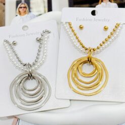COLLAR Y ARETE DOBLE CAIDA Y PERLA CON DIJE CIRCULARES