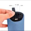 Diseño: Tiene un formato cilíndrico portátil, fácil de llevar. Presenta un diseño con acabado en tela.