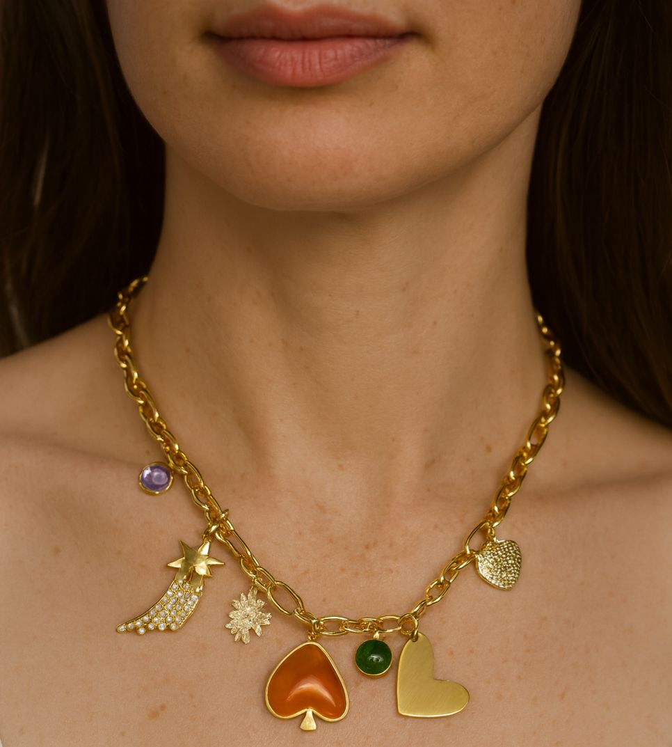 Este collar de charms en acero inoxidable está lleno de color, símbolos y personalidad: