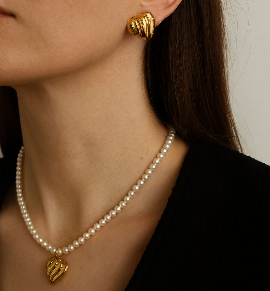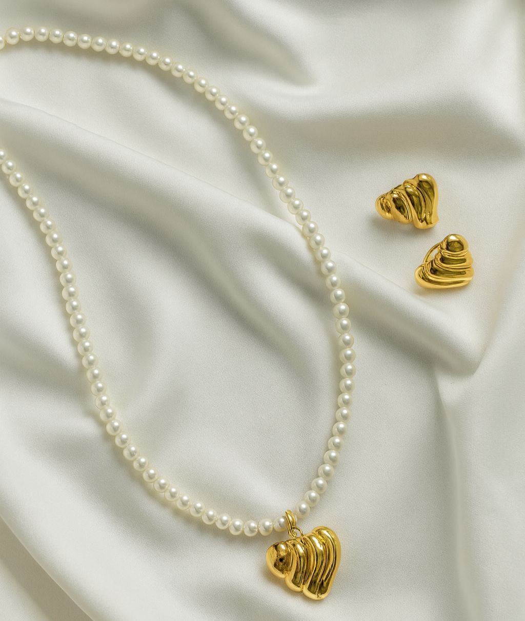 Collar de perlas con dije dorado en forma de corazón y aretes a juego, ideal para realzar cualquier look.