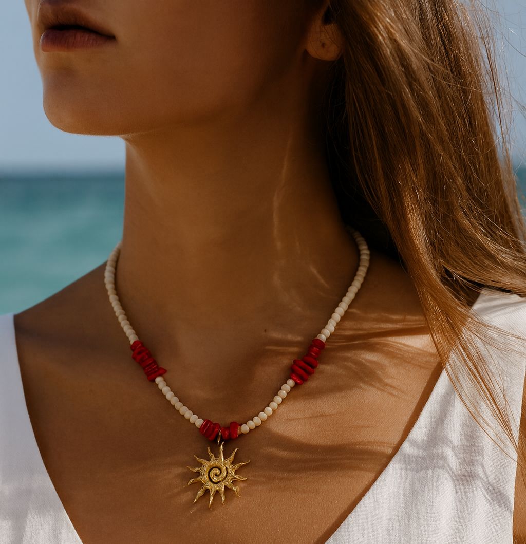 COLLAR CRISTAL ROJO Y DIJE SOL TRIBAL