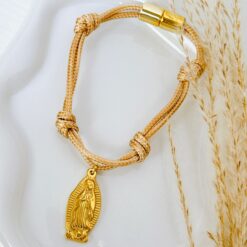 PULSERA AJUSTABLE DE TELA ROSA Y DIJE DEL SAGRADO CORAZON
