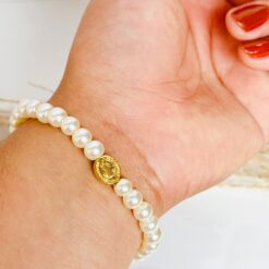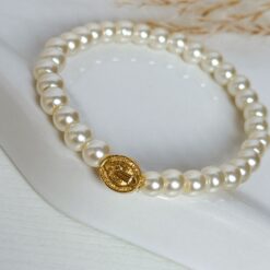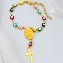 PULSERA AJUSTABLE DE TELA ROSA Y DIJE DEL SAGRADO CORAZON