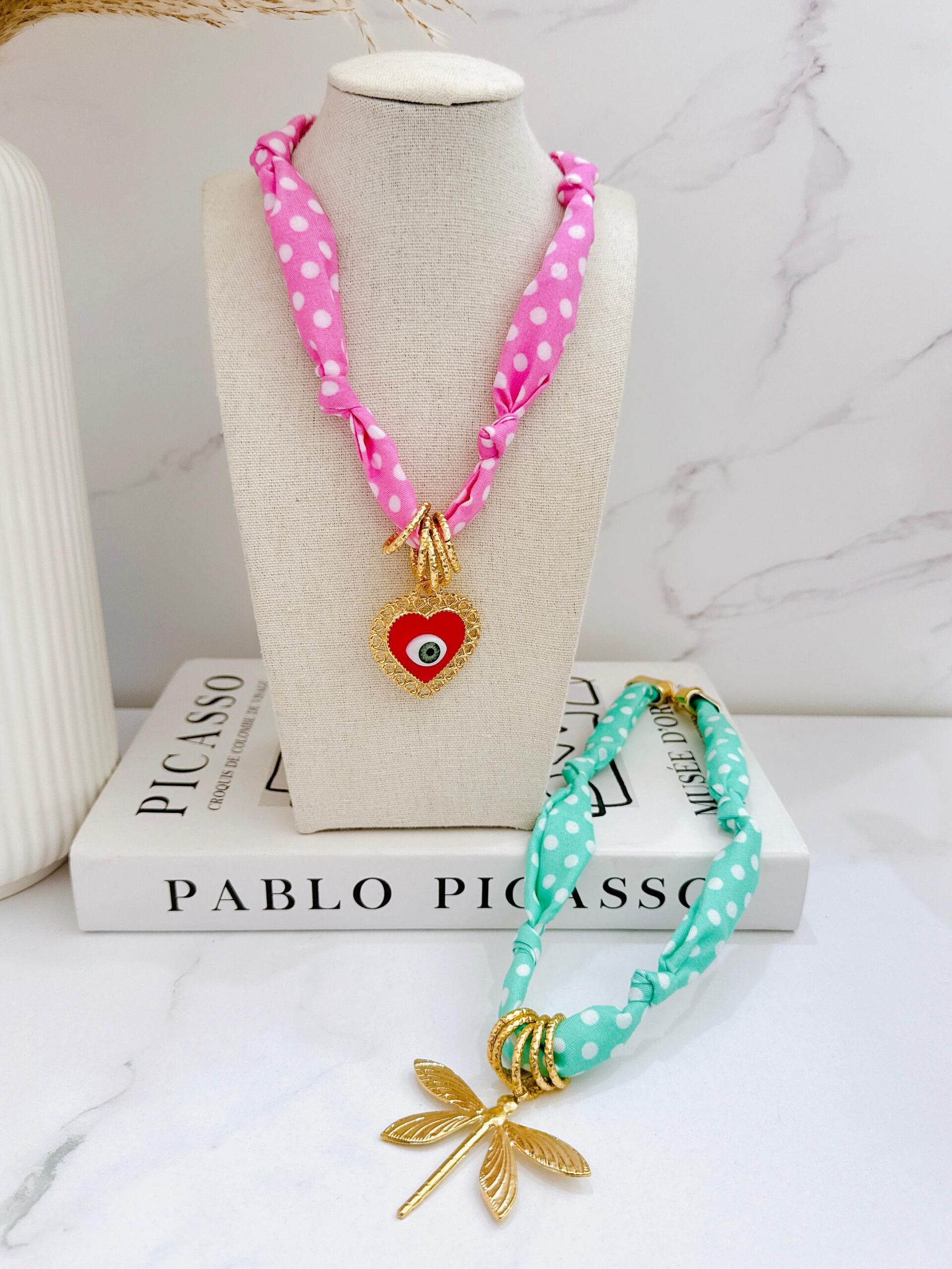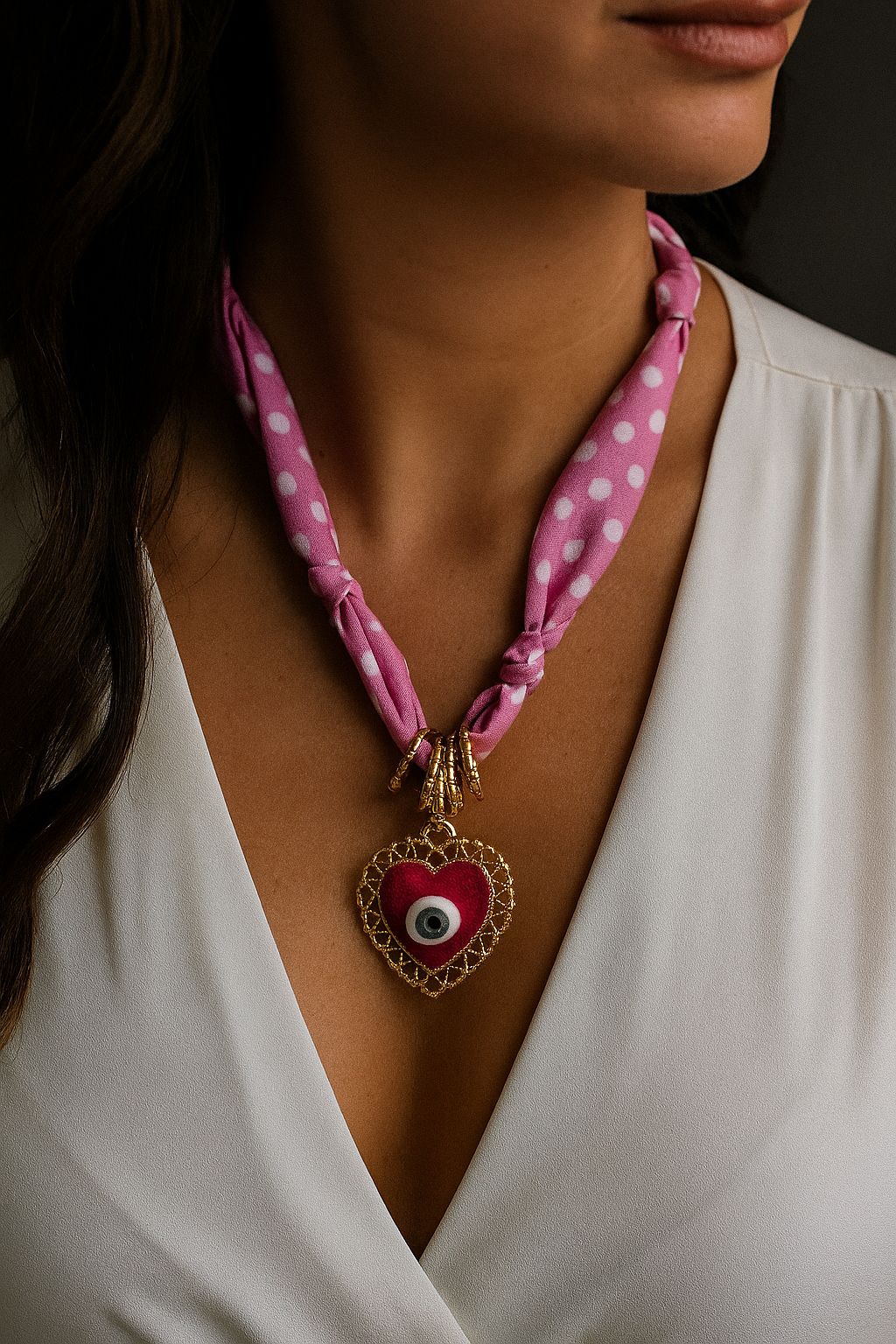 COLLAR DE TELA CON DIJE OJO TURCO Y CORAZON V2