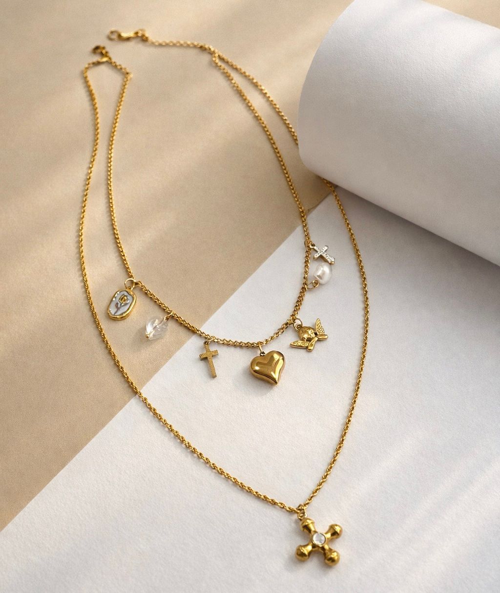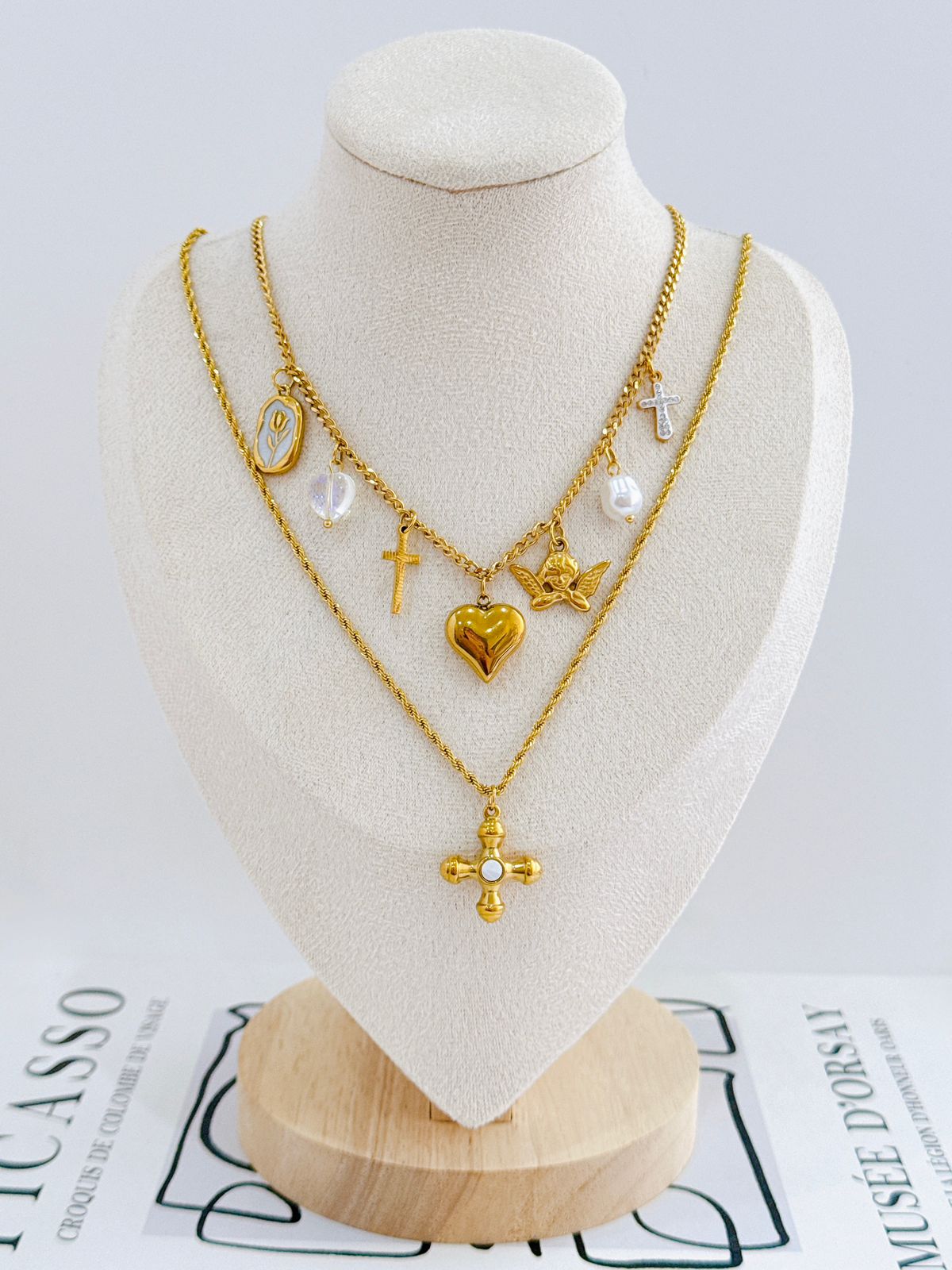 COLLAR DOBLE CAIDA CON MULTI CHARMS Y CRUZ