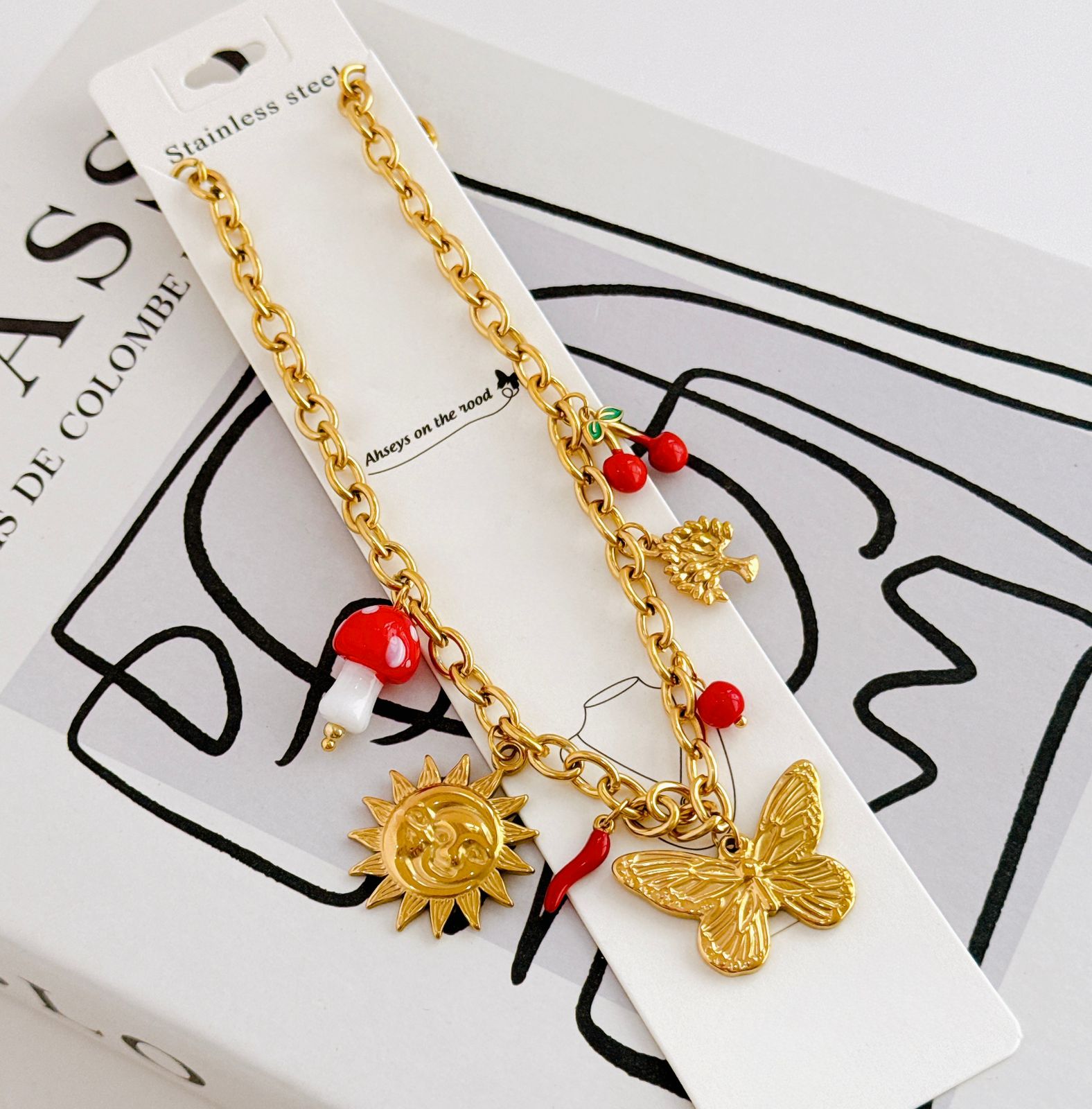 COLLAR ESLABON CON MULTI CHARMS DE MARIPOSA DORADO