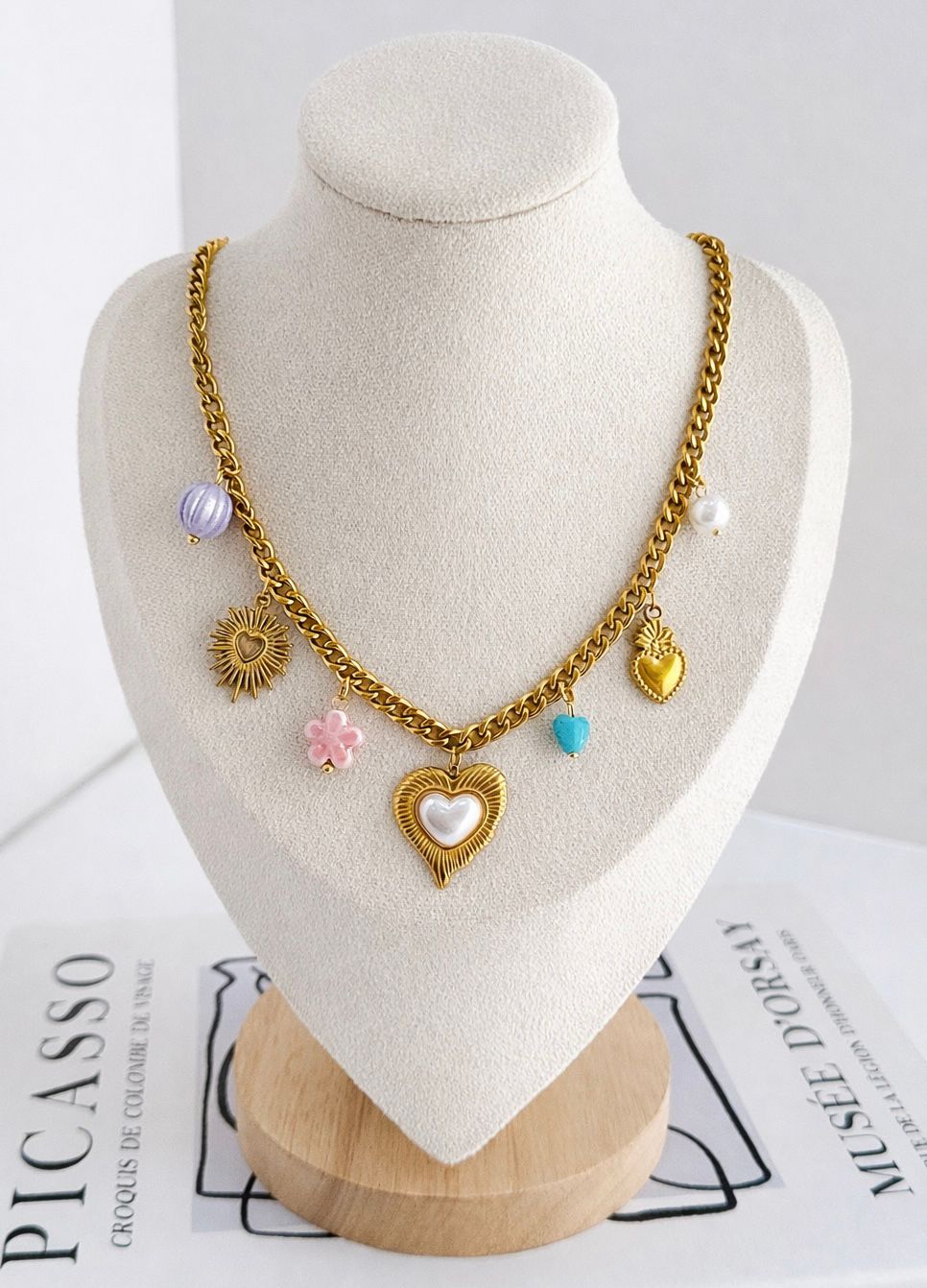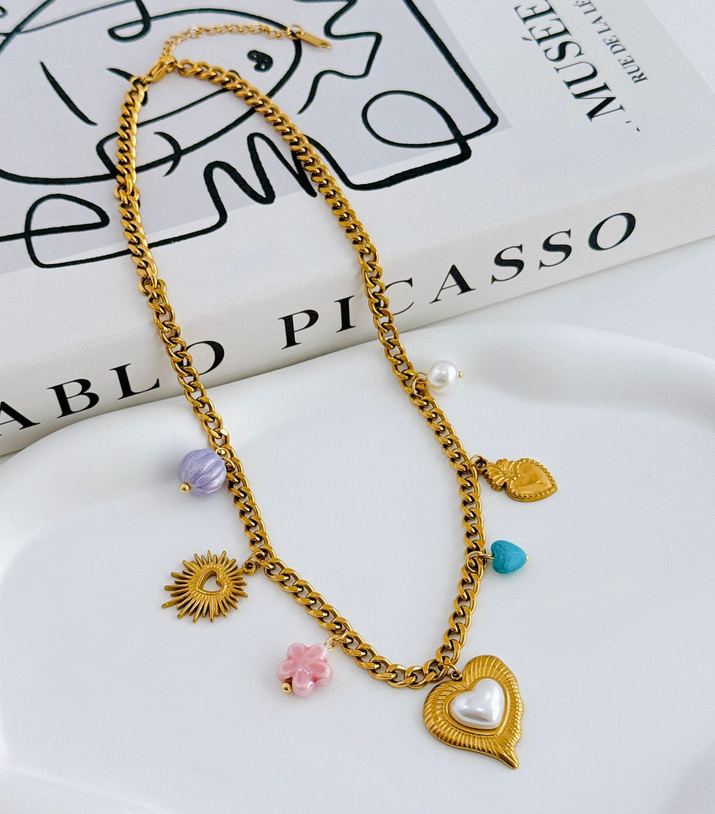 COLLAR MULTI CHARMS CON DIJE CORAZON CON PERLA