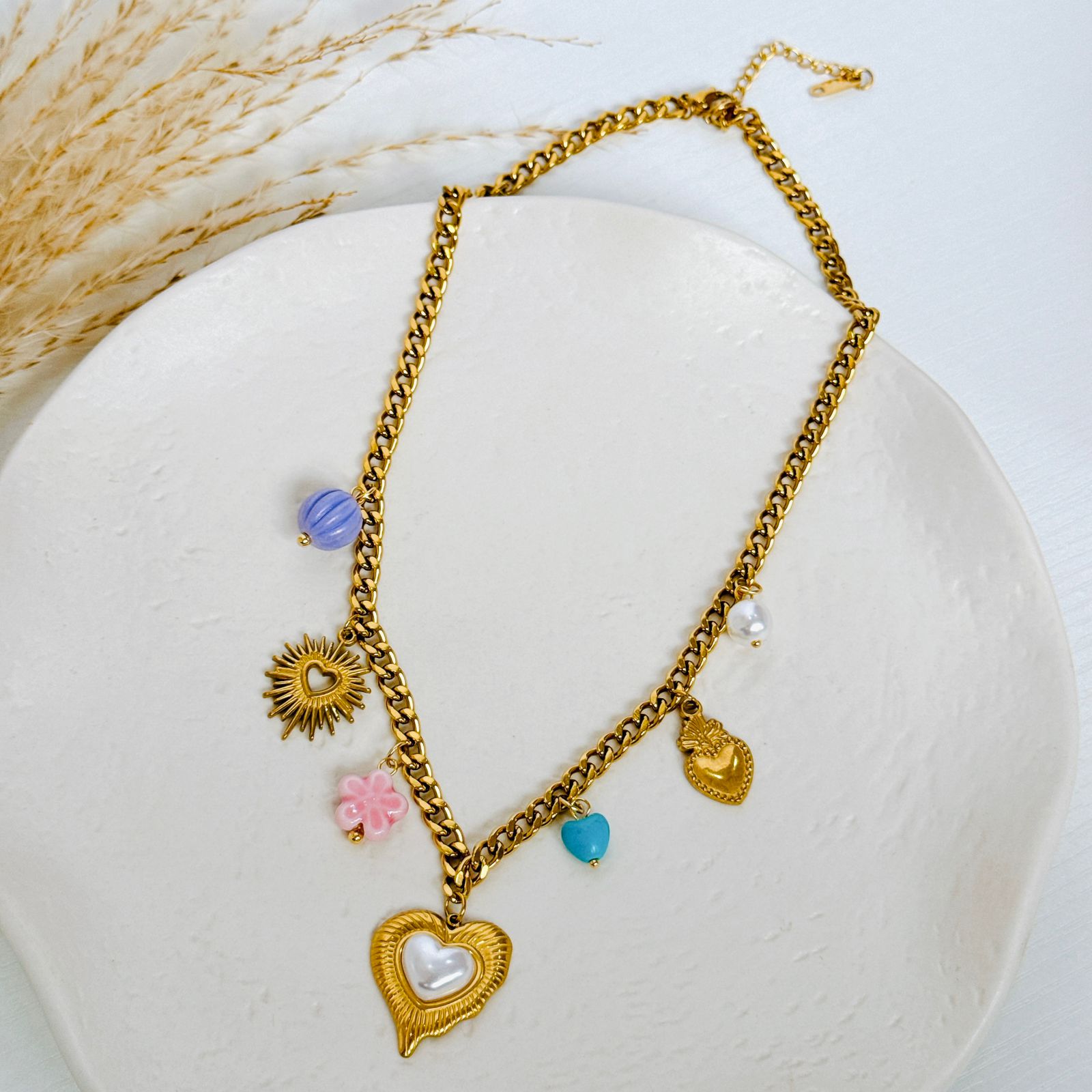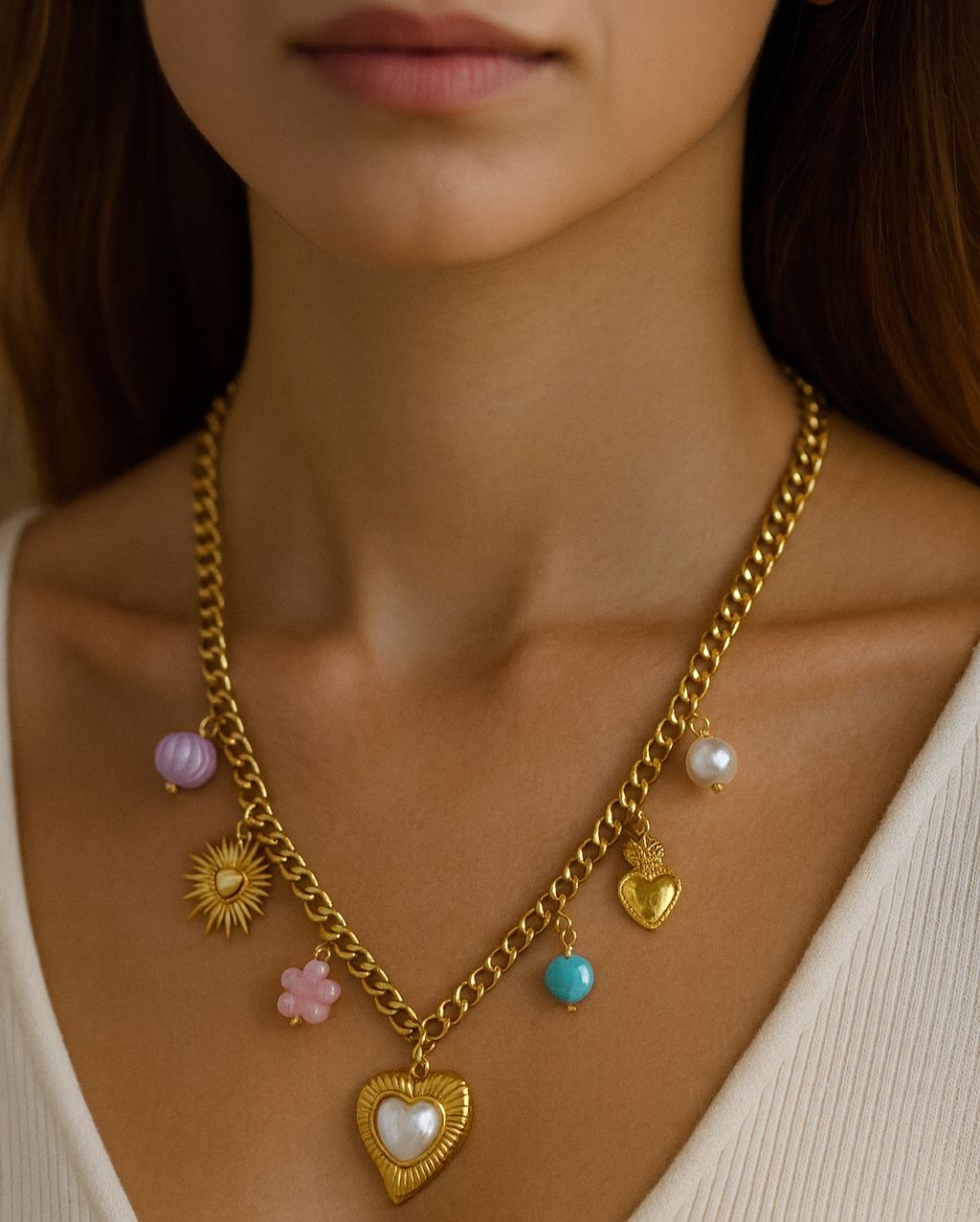 COLLAR MULTI CHARMS DOBLE CORAZON BLANCO