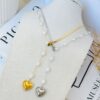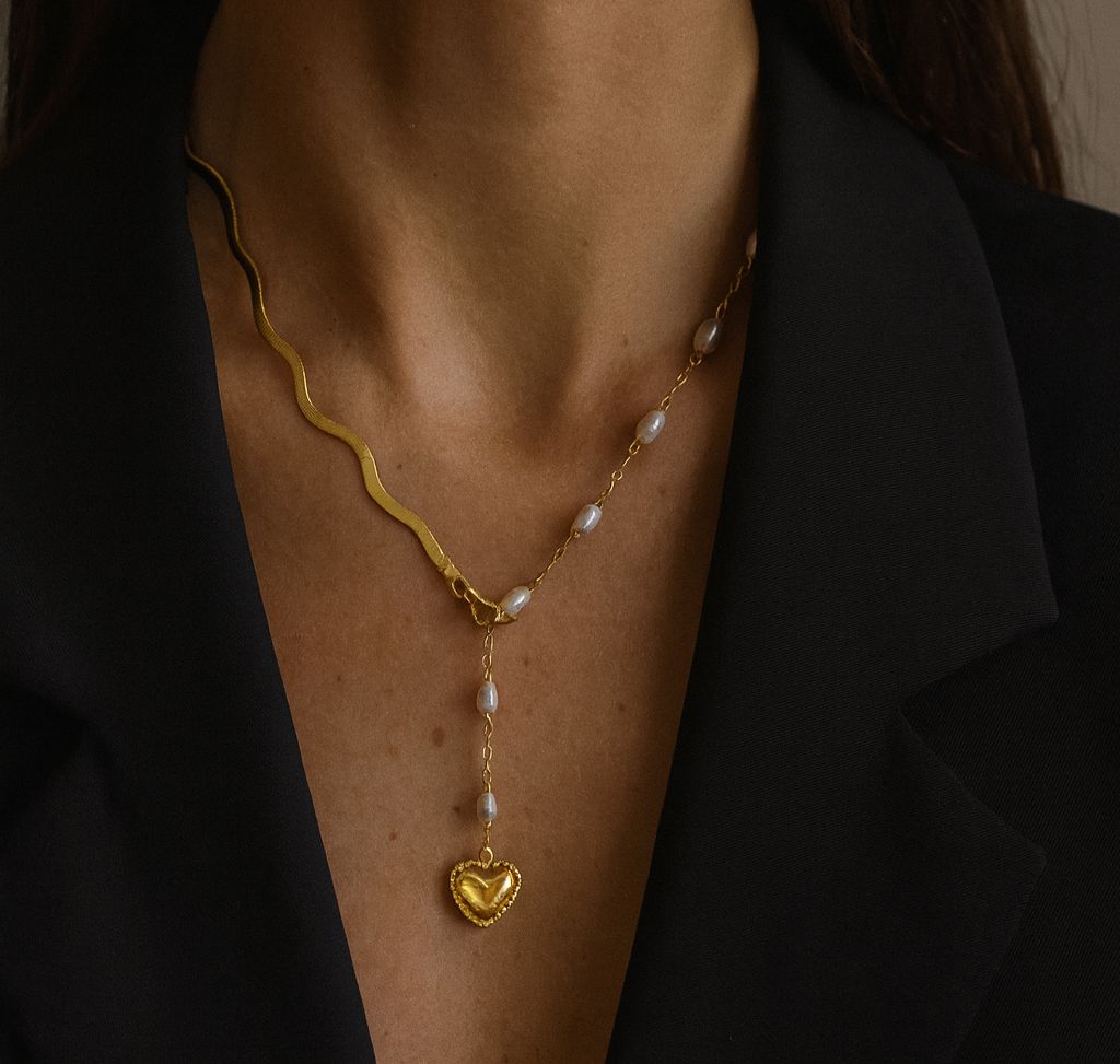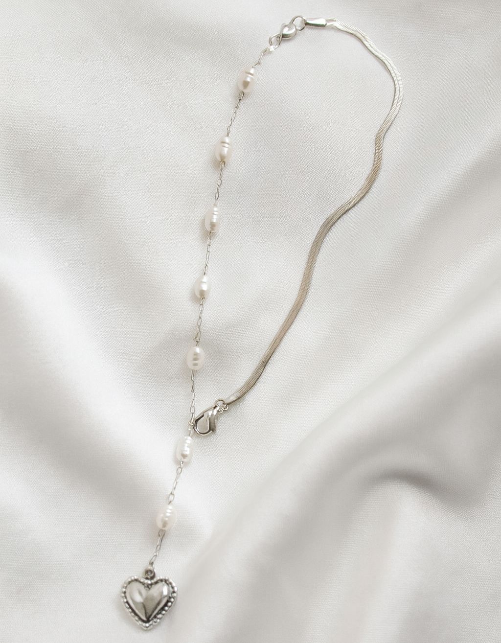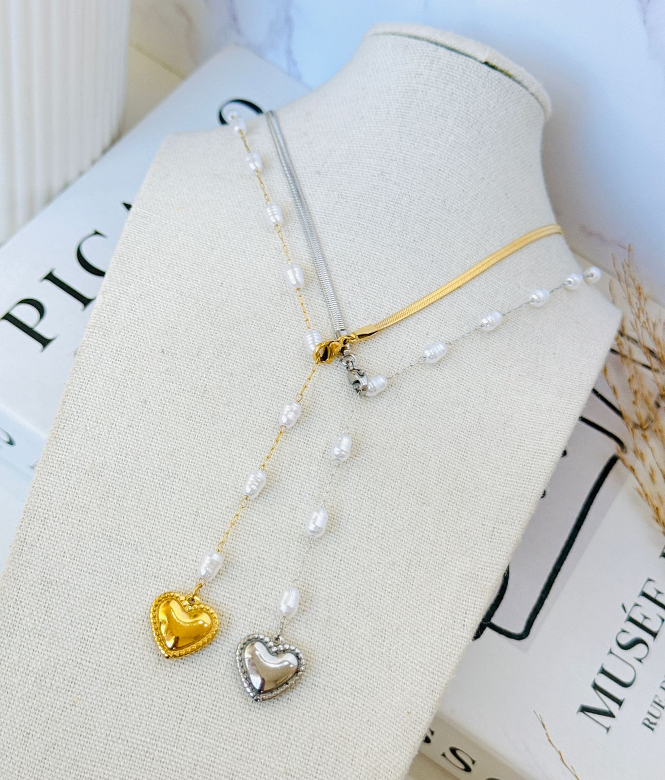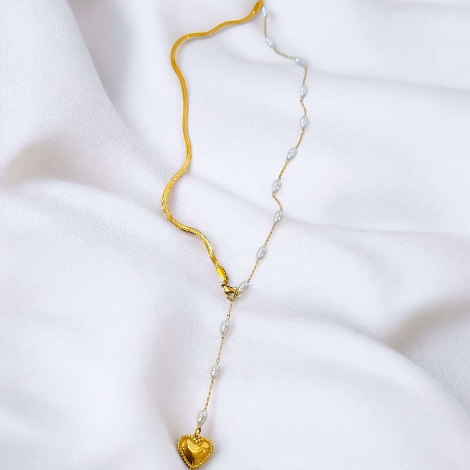 COLLAR PANZA DE VIBORA Y PERLA CRUZADA CORAZON DORADO/PLATA