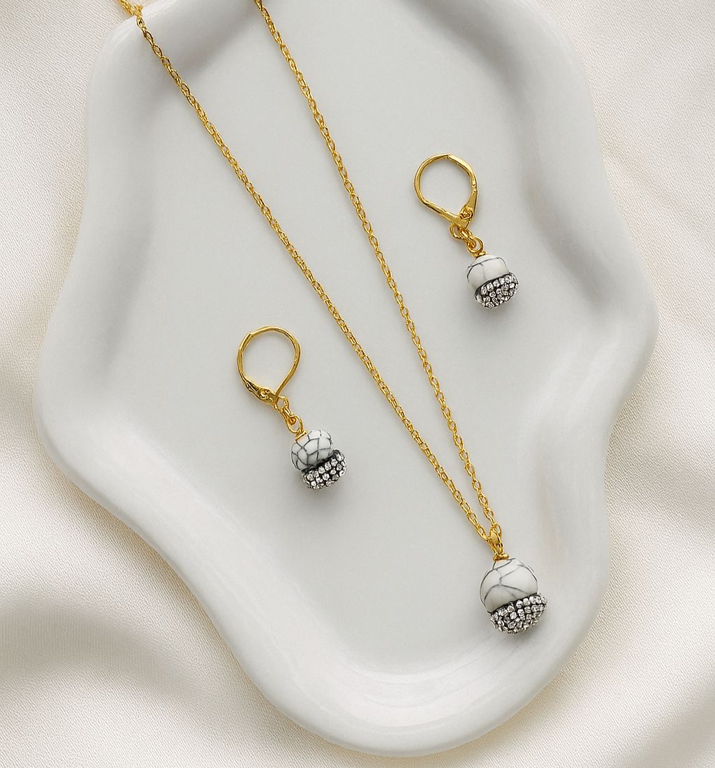 COLLAR Y ARETE BOLITA CON PIEDRA NATURAL
