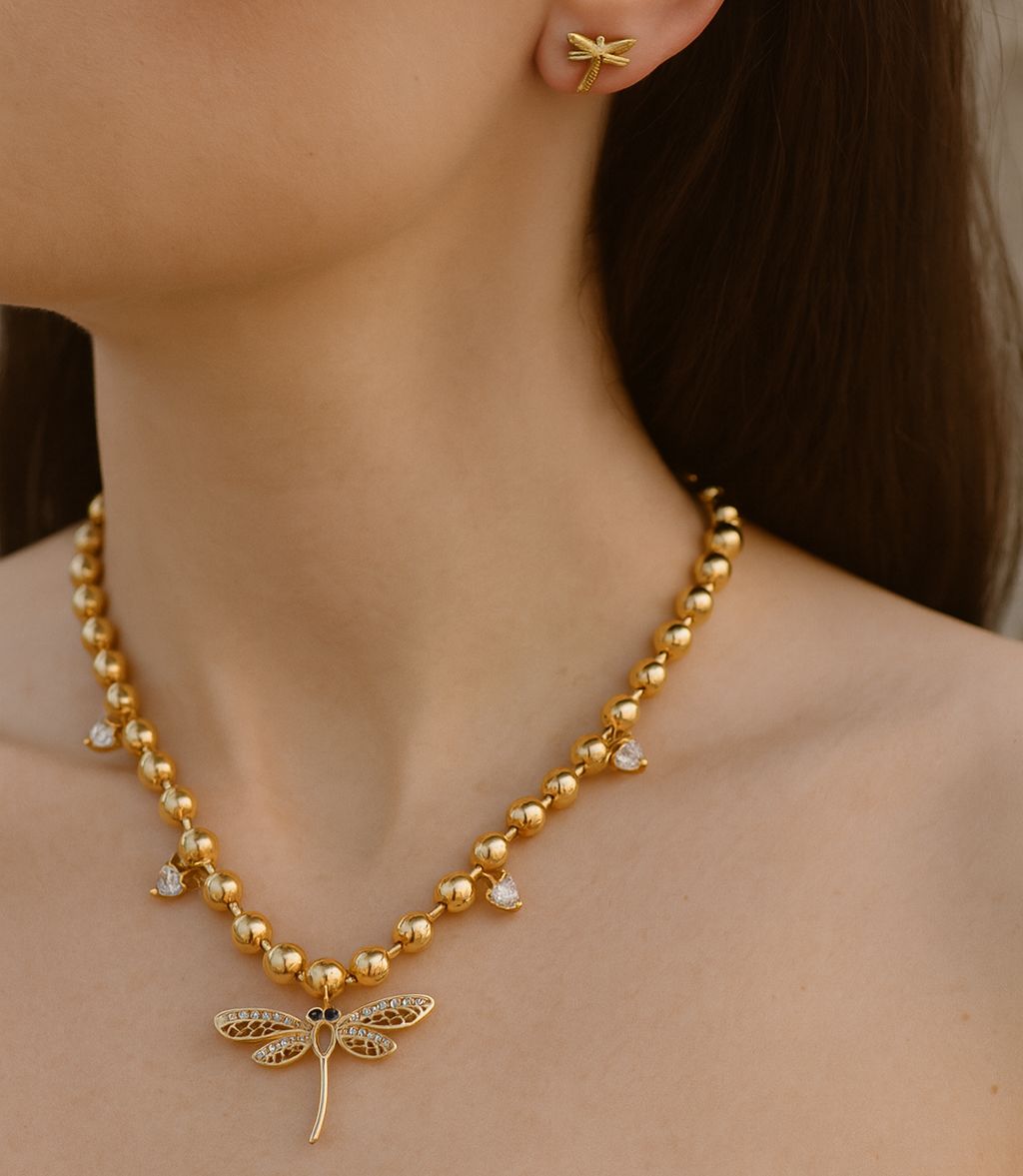 COLLAR Y ARETE BOLITA MULTI CRISTALES LIBELULA