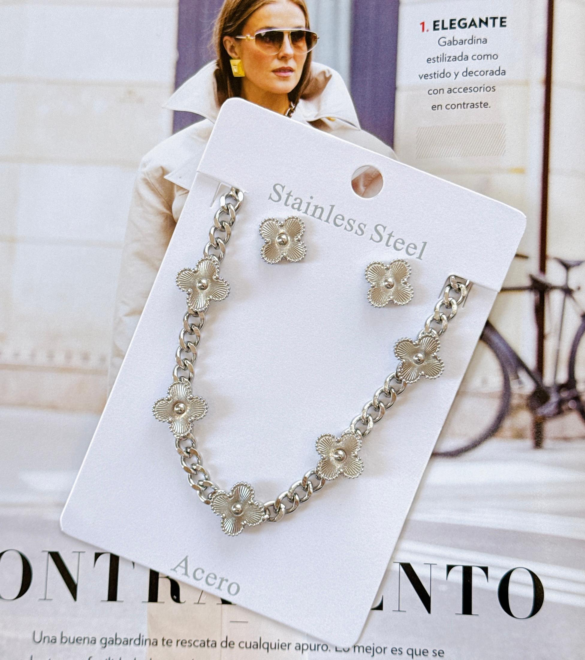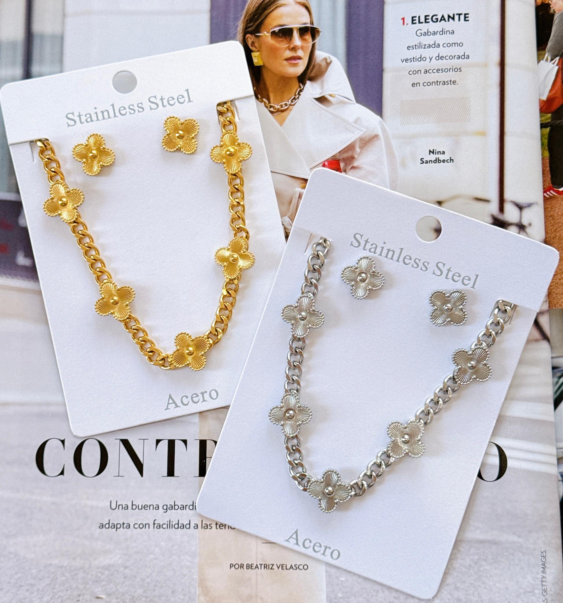 COLLAR Y ARETE CADENA TREBOL DORADO/PLATA