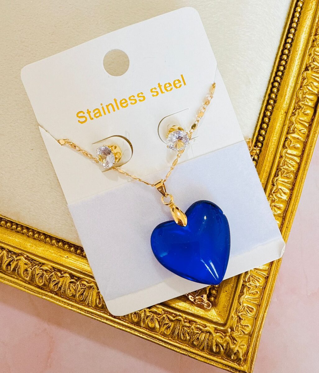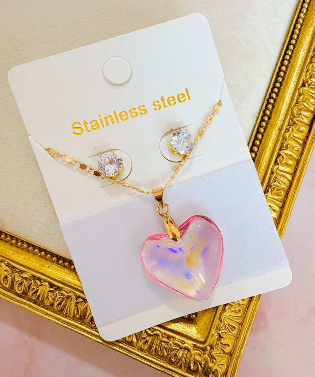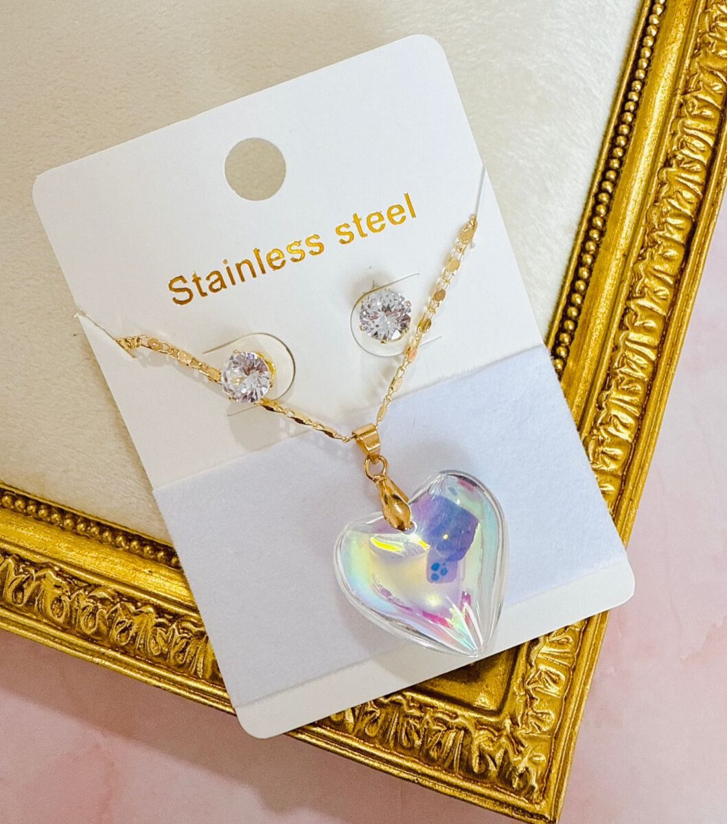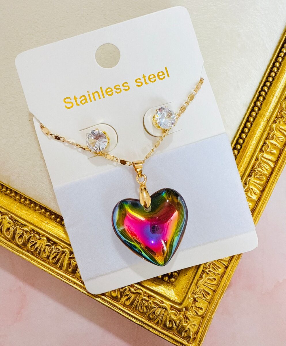 COLLAR Y ARETE CORAZON GRANDE MULTICOLORES