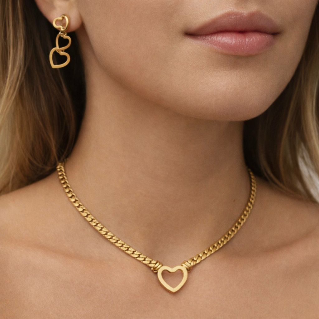 COLLAR Y ARETE CUBANO CON SILUETA CORAZON