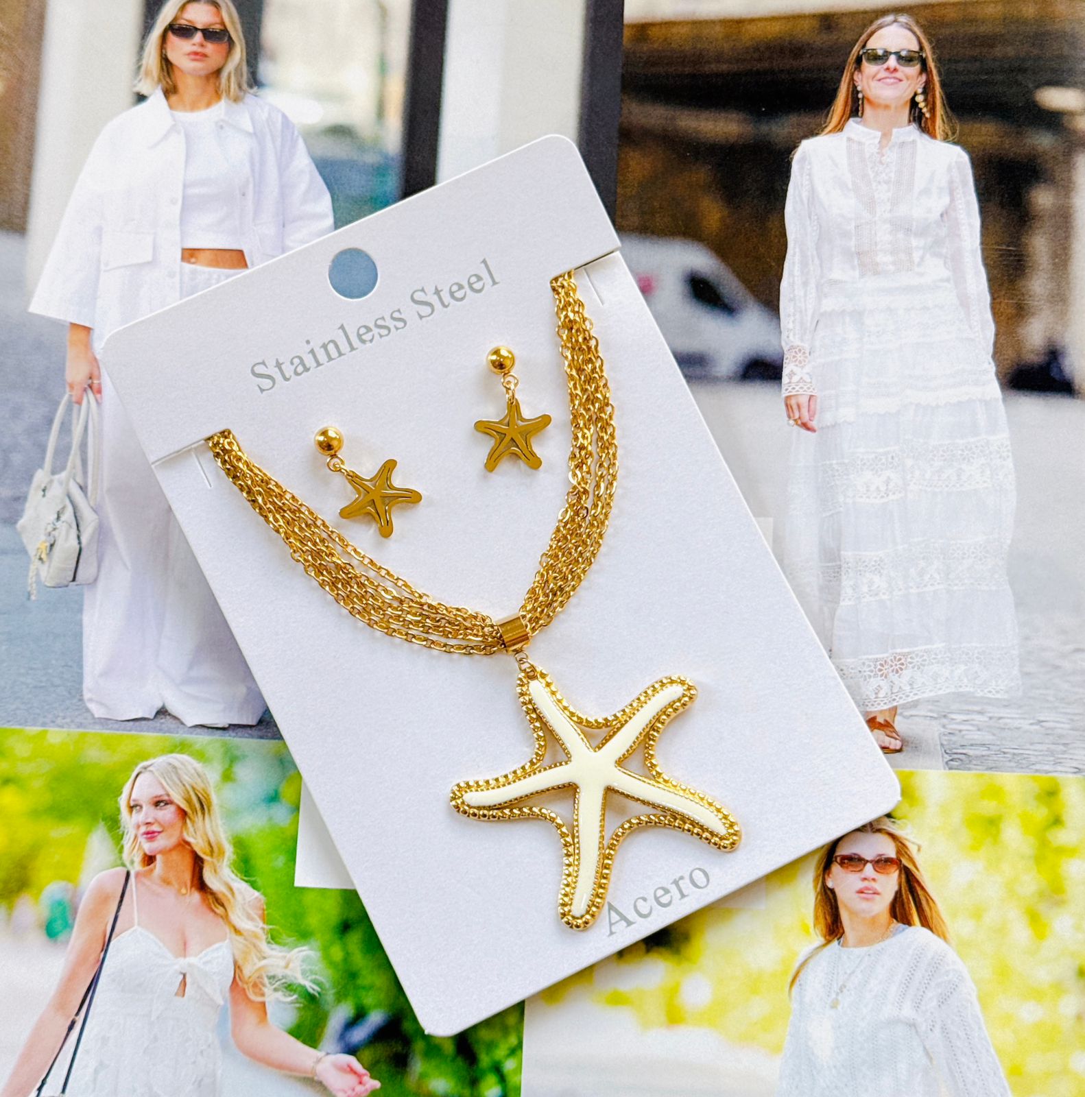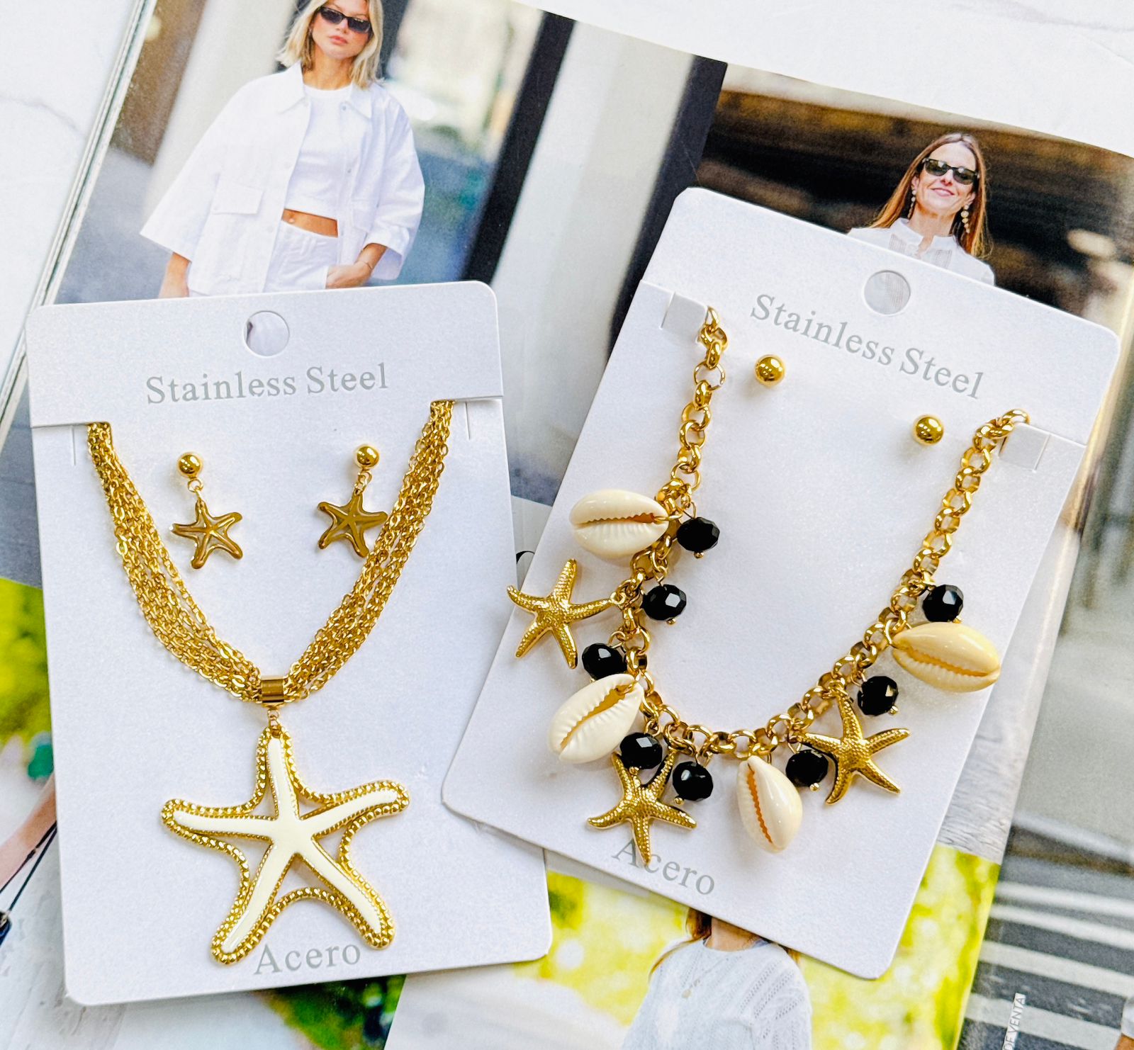 COLLAR Y ARETE DE ESTRELLA DE MAR CON CONCHA
