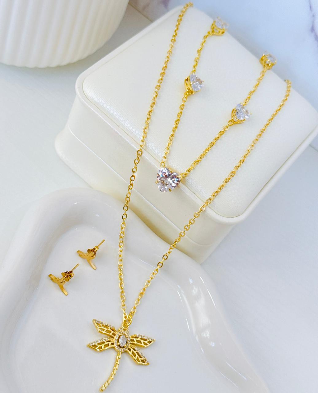COLLAR Y ARETE DOBLE CAIDA LIBELULA Y CORAZON CRISTAL
