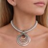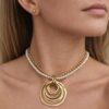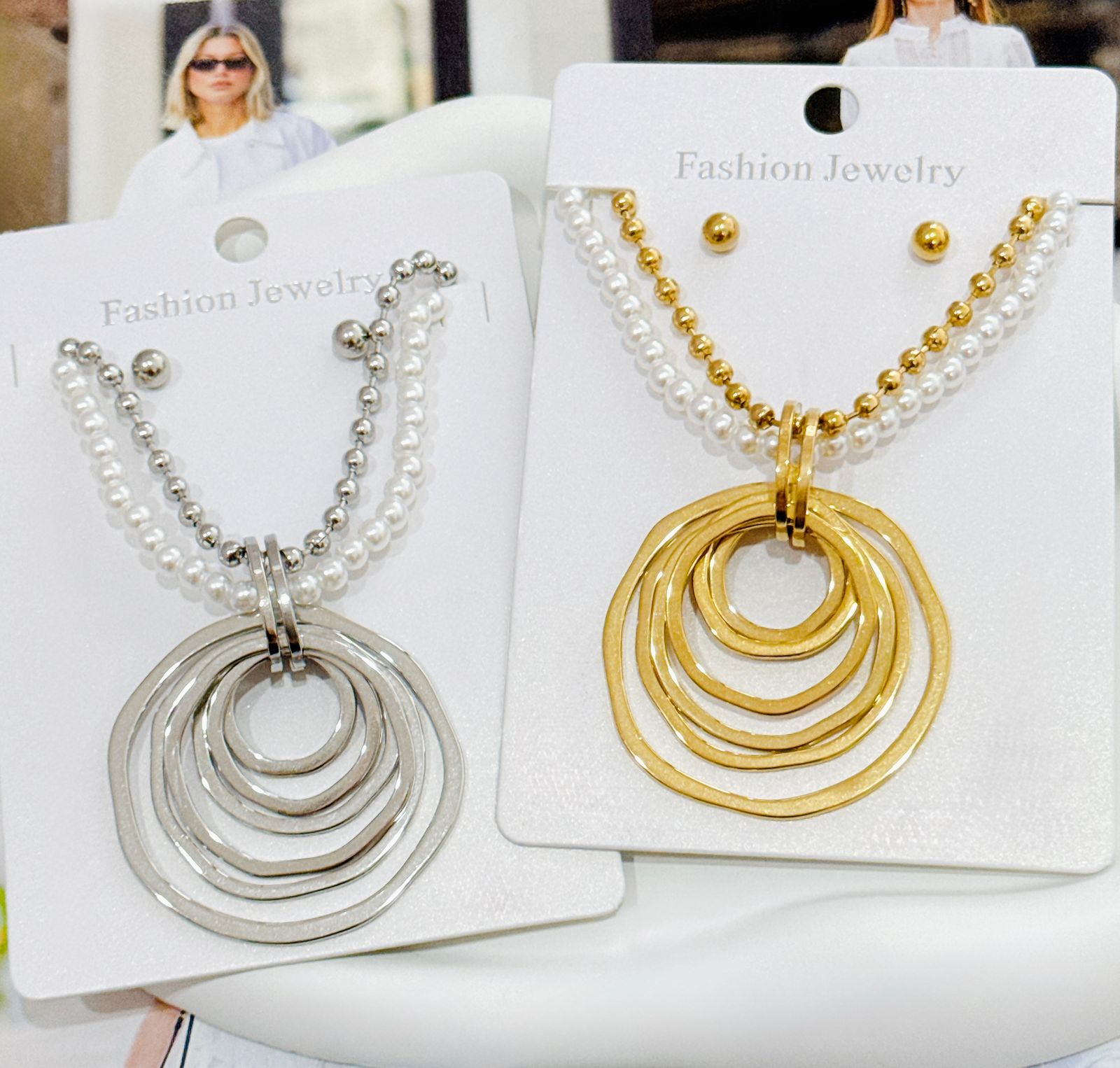 COLLAR Y ARETE DOBLE CAIDA Y PERLA CON DIJE CIRCULARES