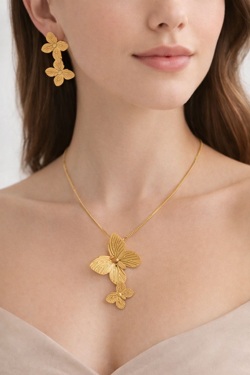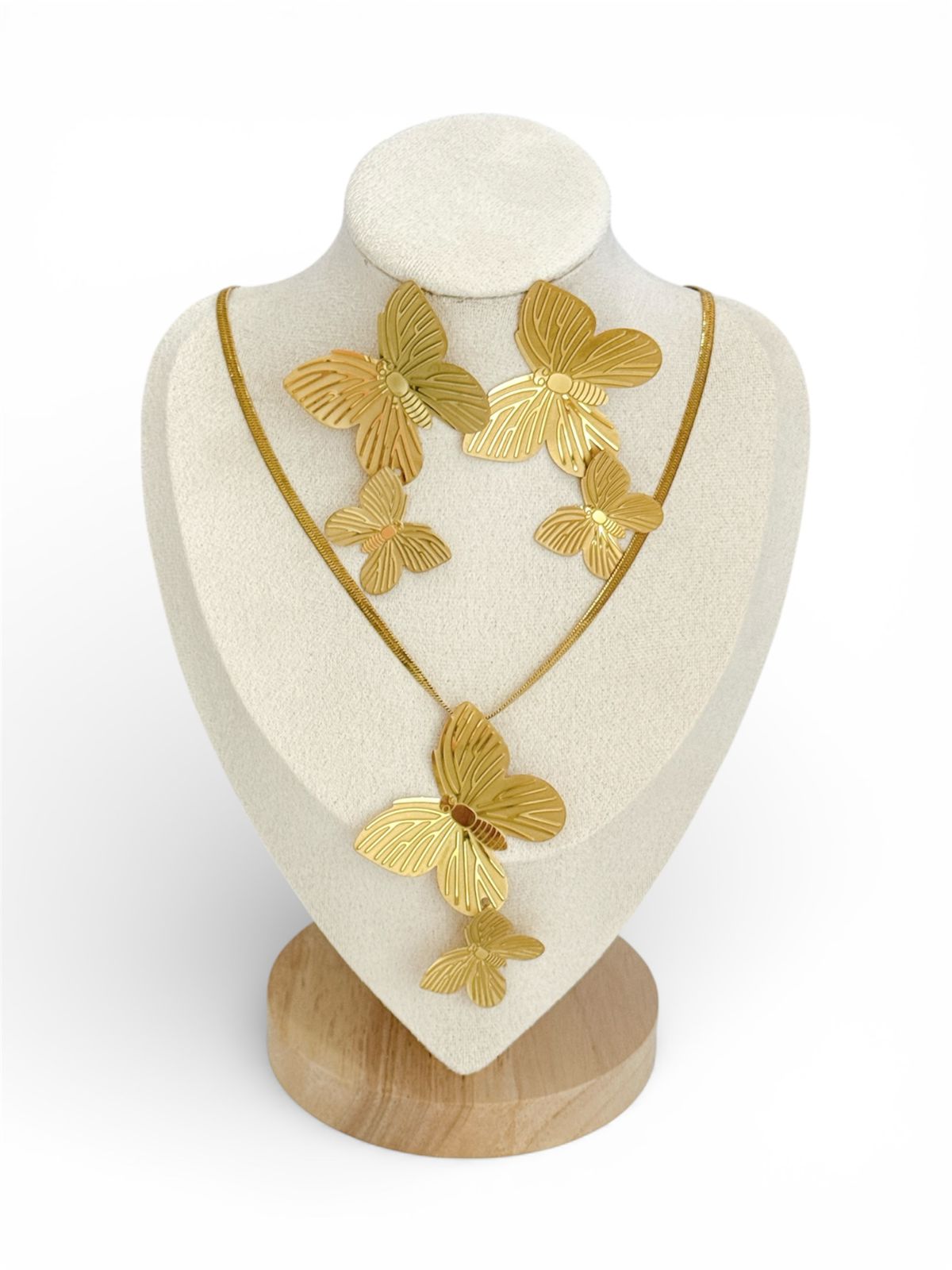 COLLAR Y ARETE DOBLE MARIPOSA GRANDE DORADO