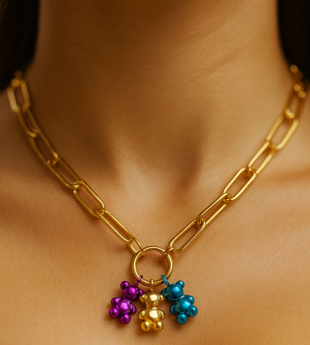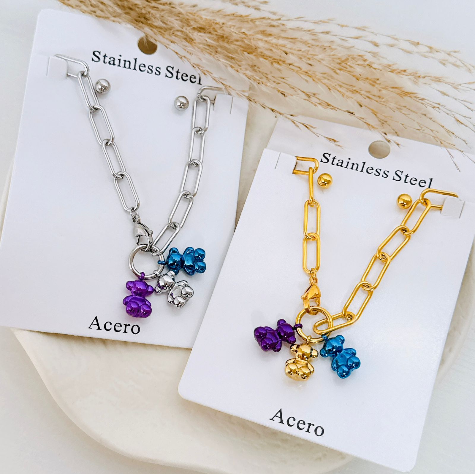 COLLAR Y ARETE ESLABON CON ARO Y 3 OSITO