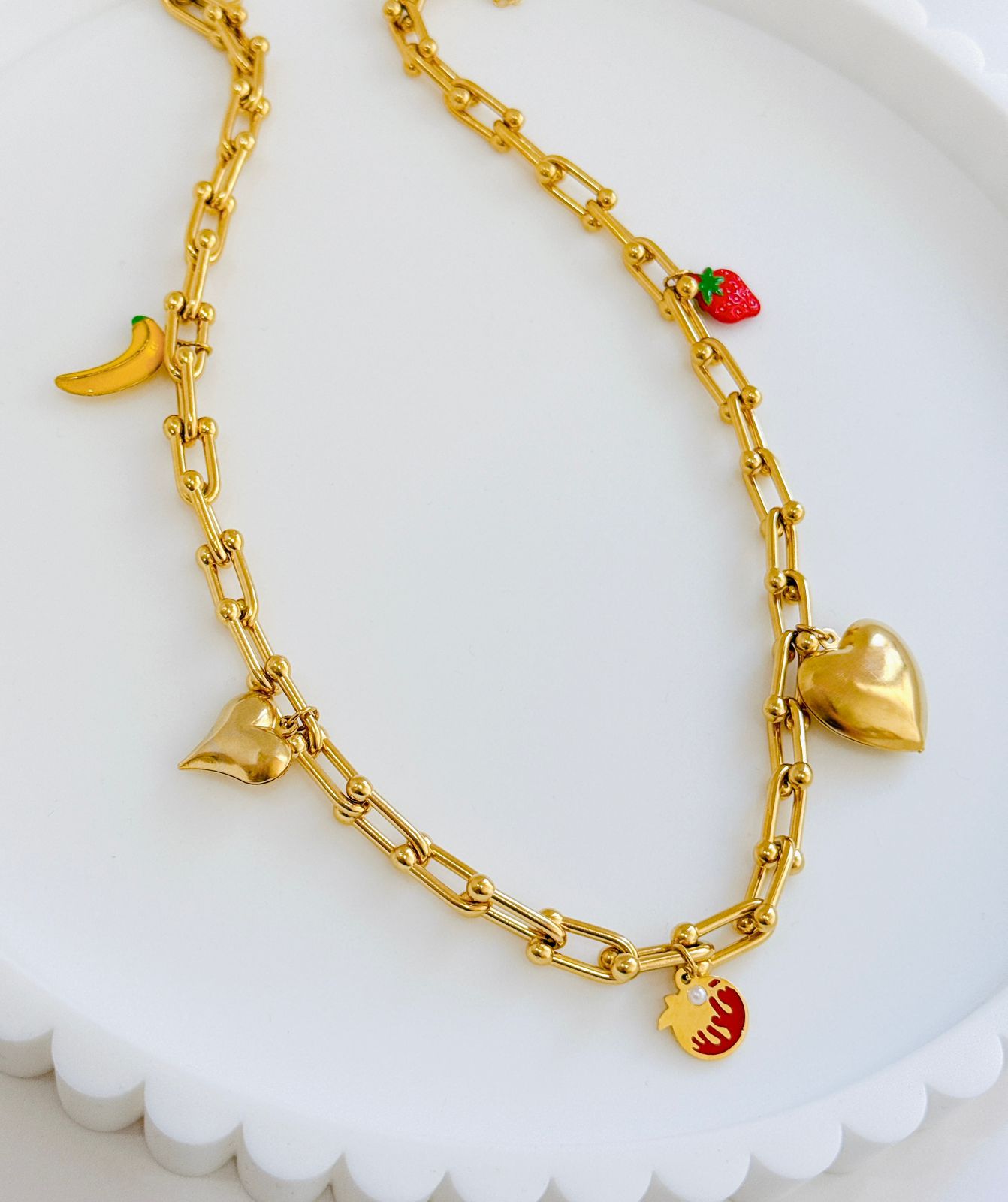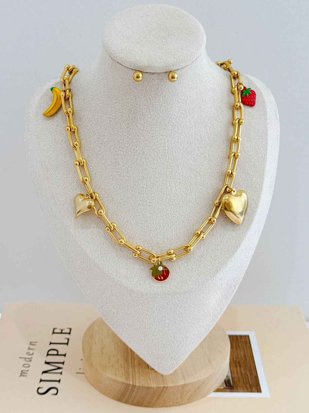 COLLAR Y ARETE ESLABON FORMA U CON MULTI CHARMS FRESA