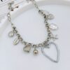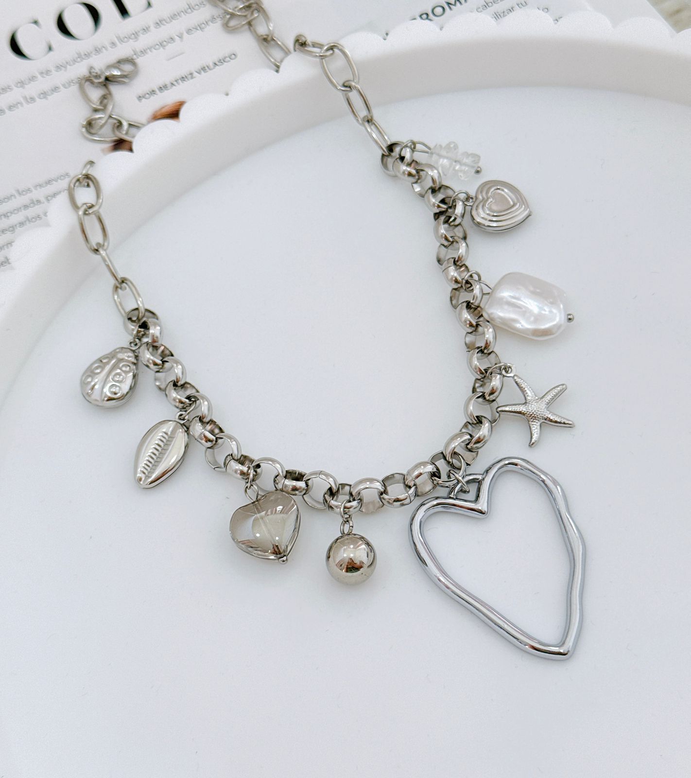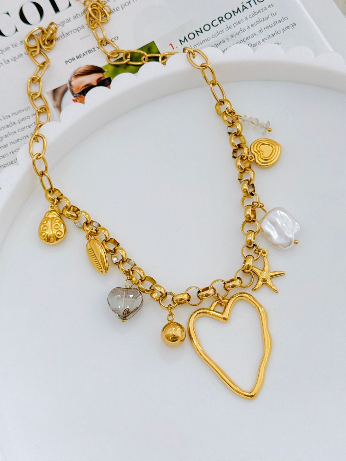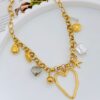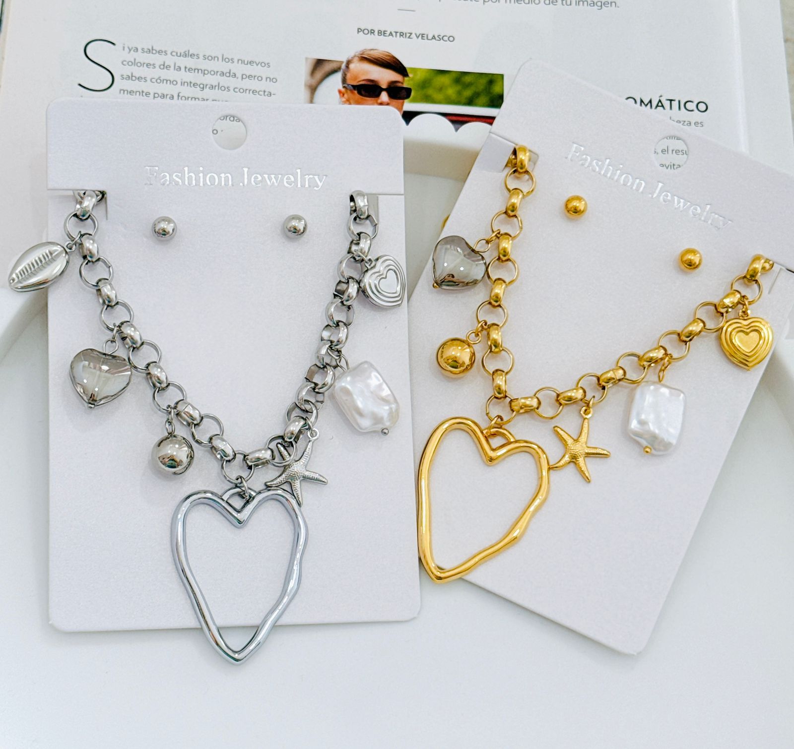 COLLAR Y ARETE ESLABON MULTI CHARMS CORAZON DORADO/PLATA
