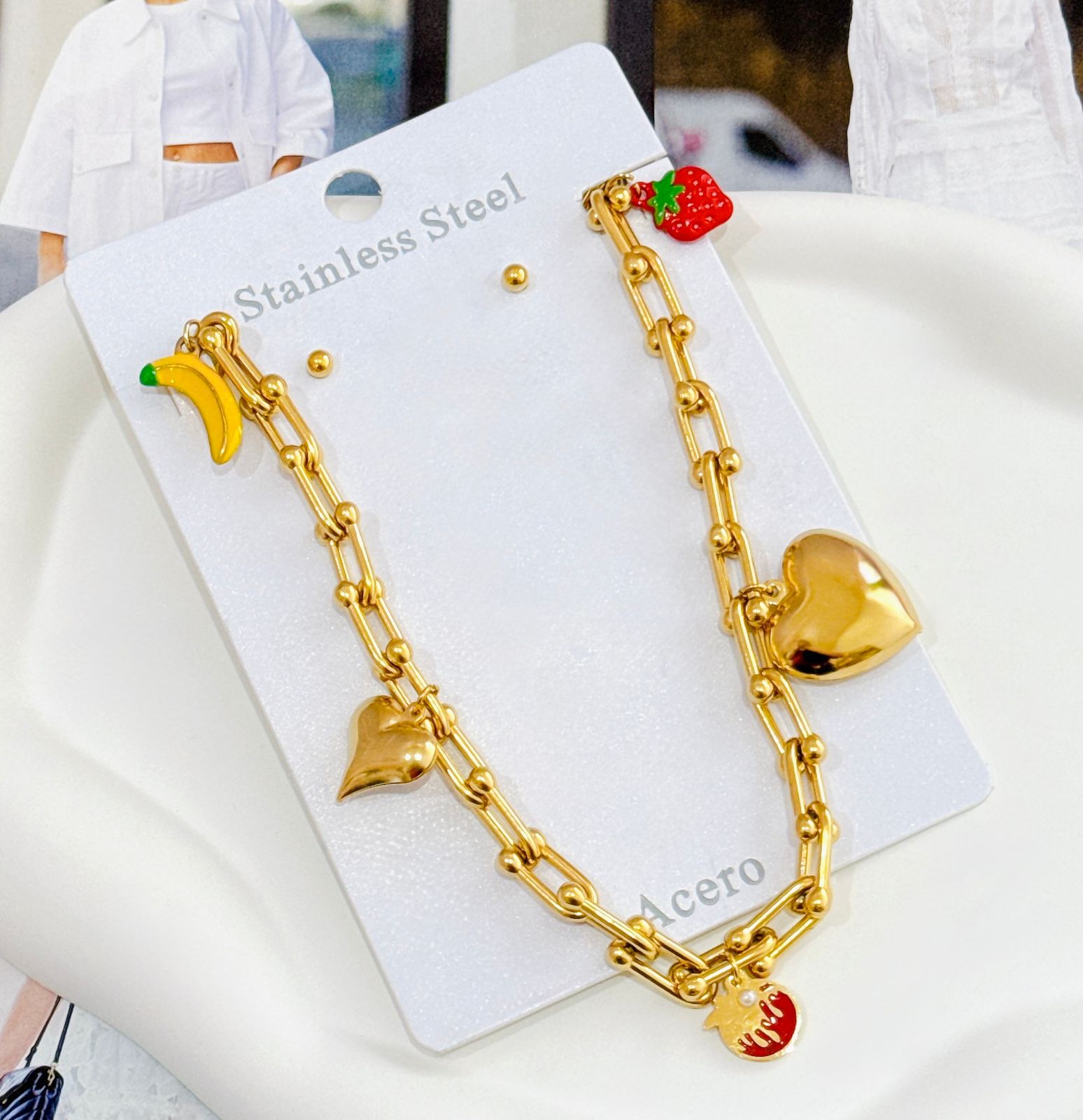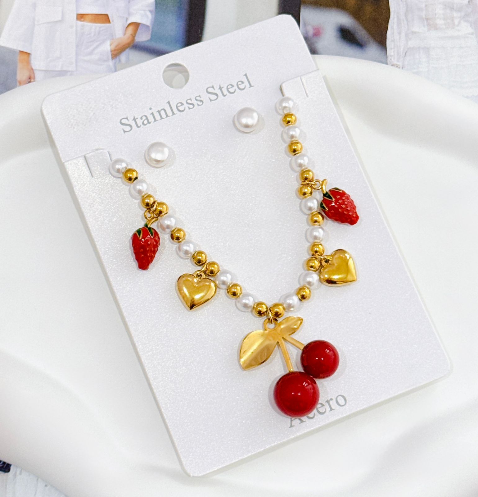 COLLAR Y ARETE GRUESO FRESA O MULTI CHARMS CEREZA