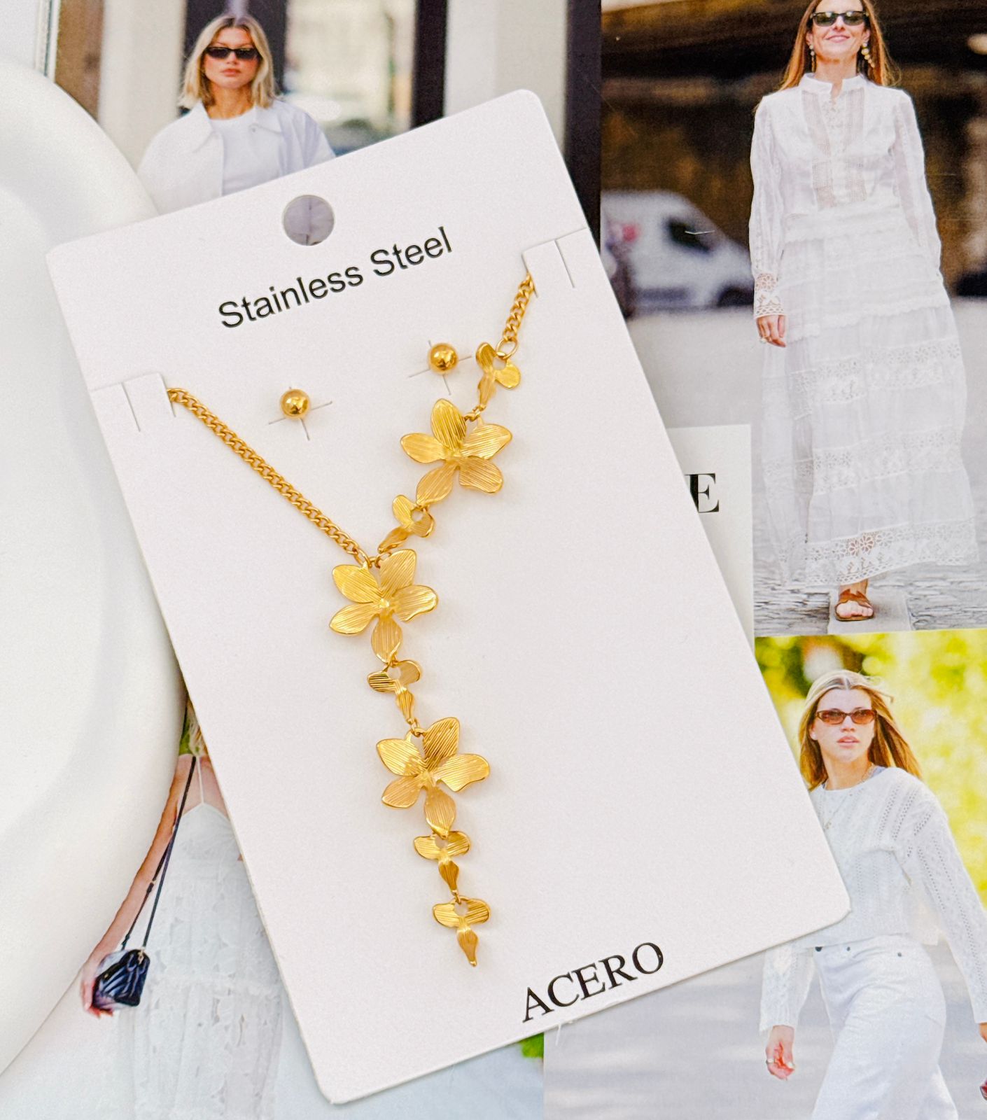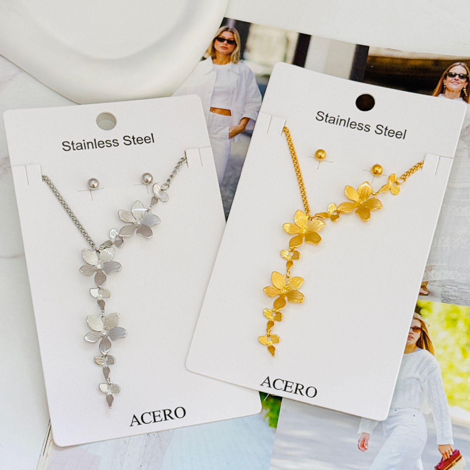 COLLAR Y ARETE LARGO CON FLORES DORADO/PLATA
