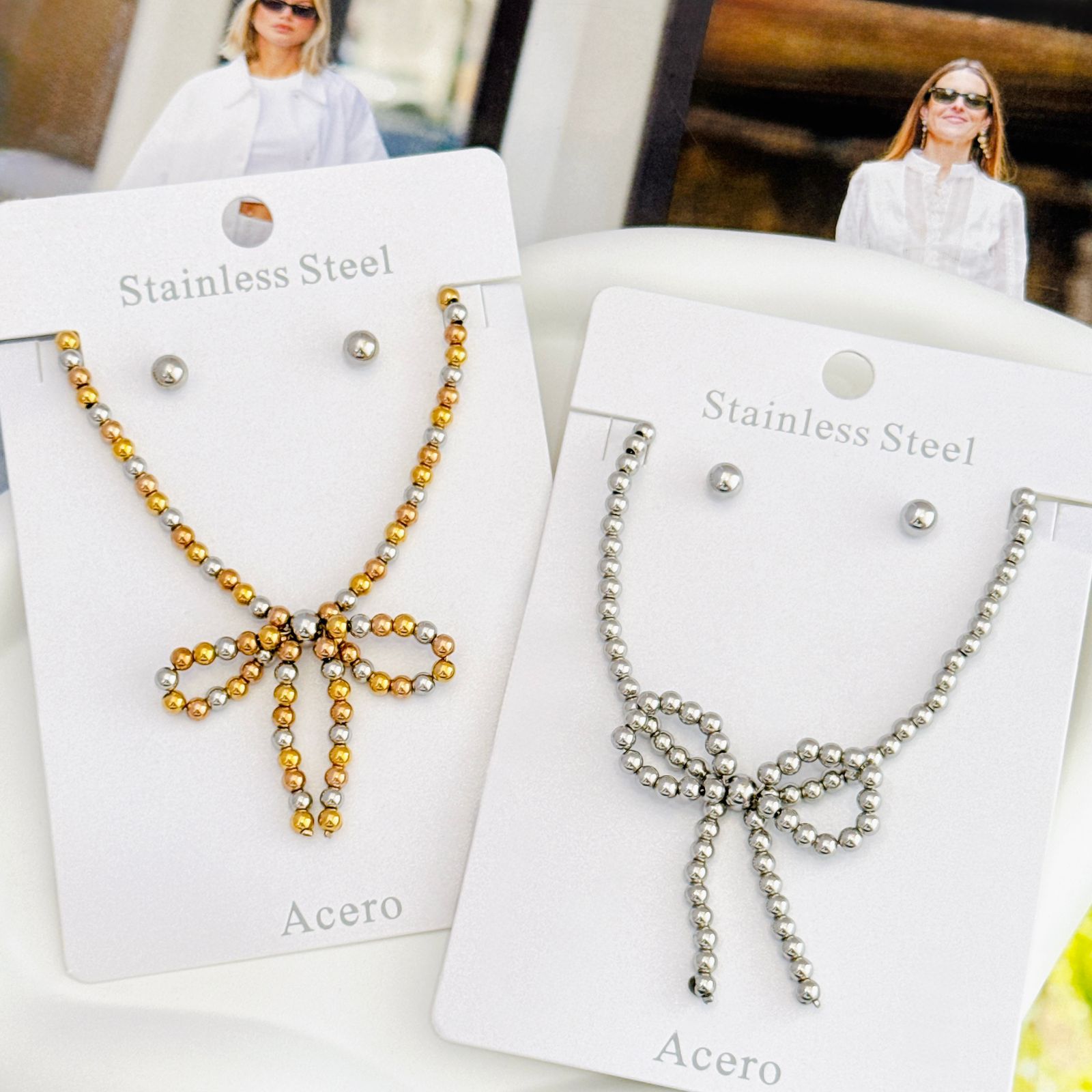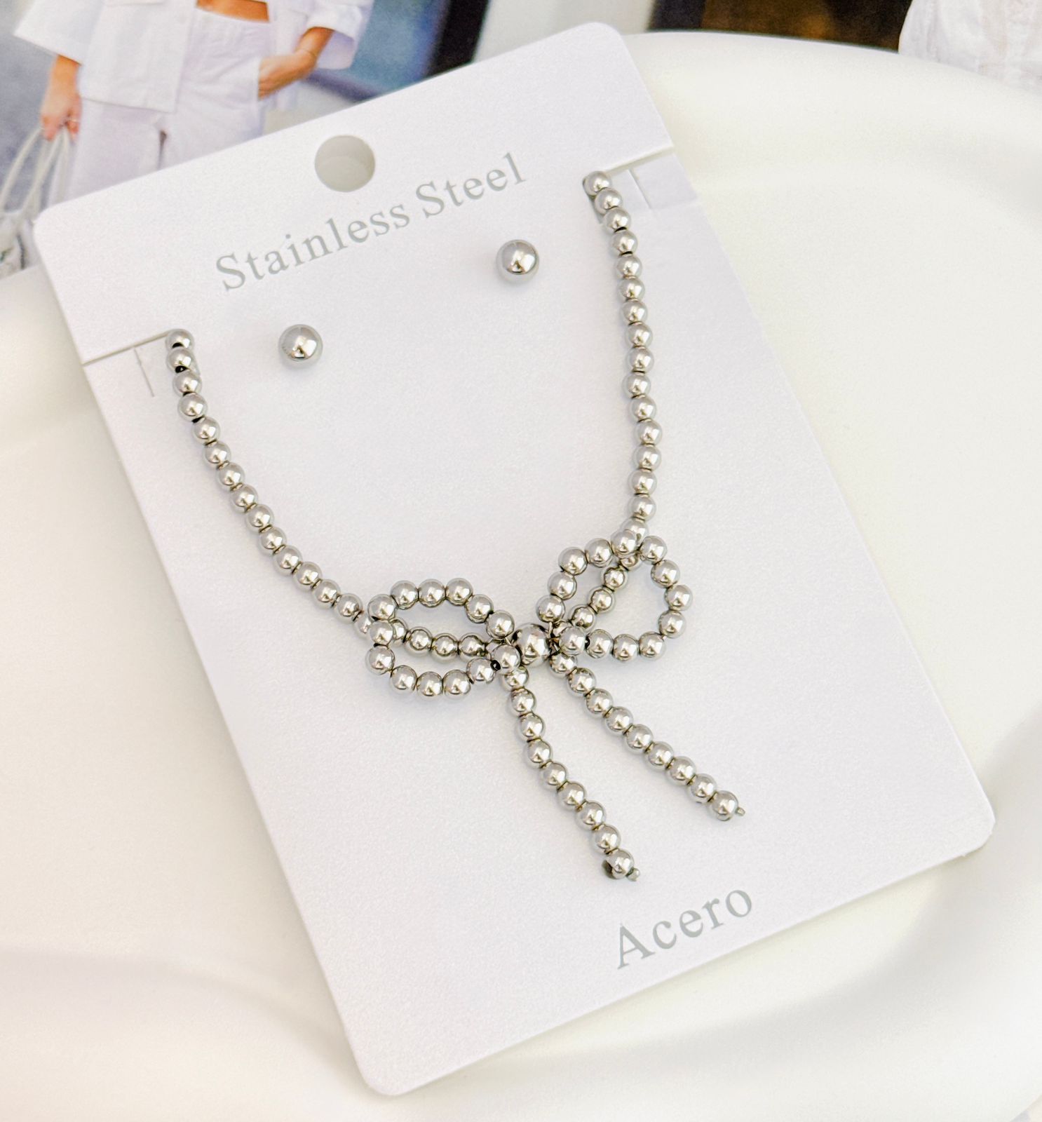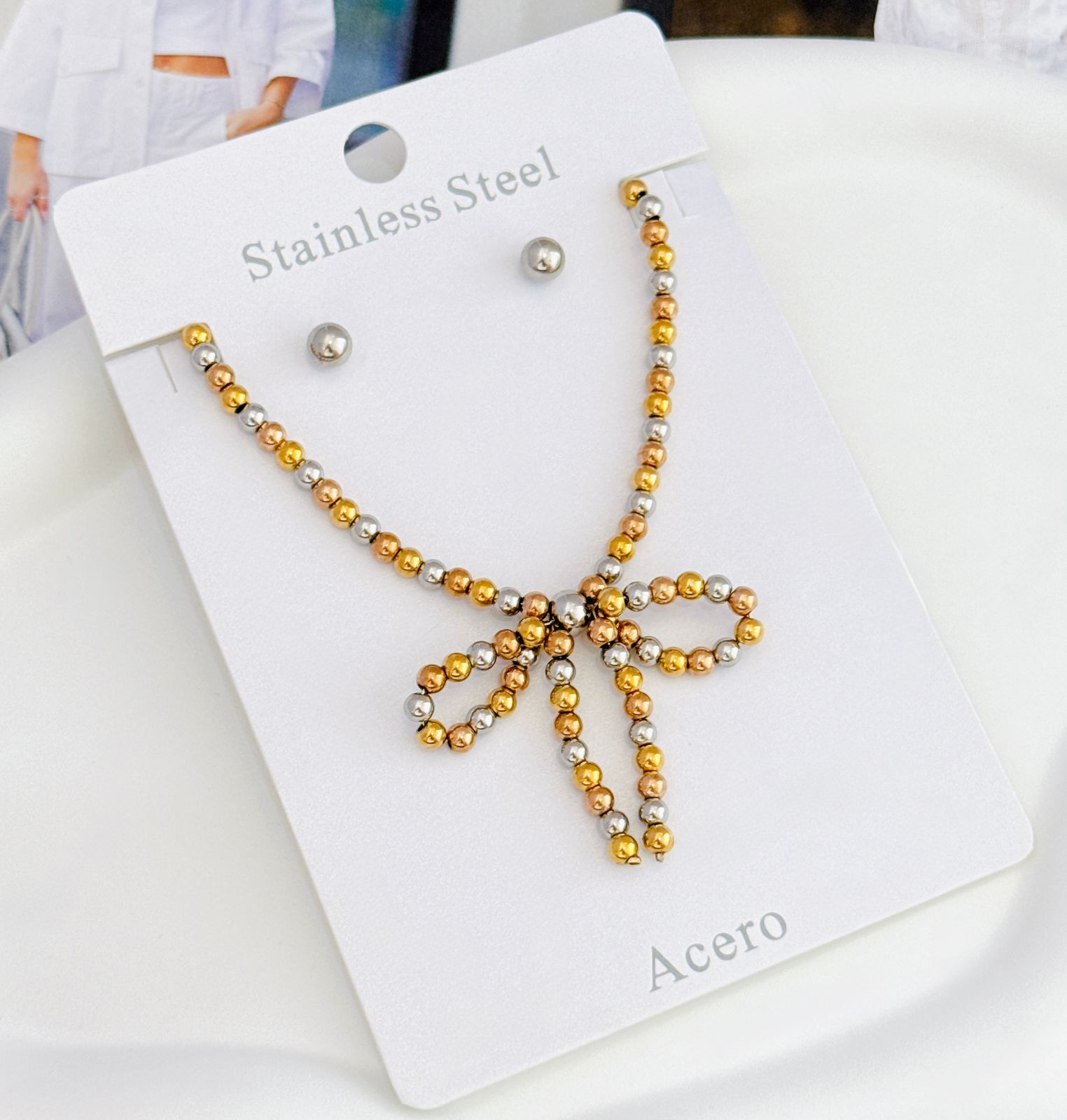 COLLAR Y ARETE MOÑO CON MULTICOLOR/PLATA