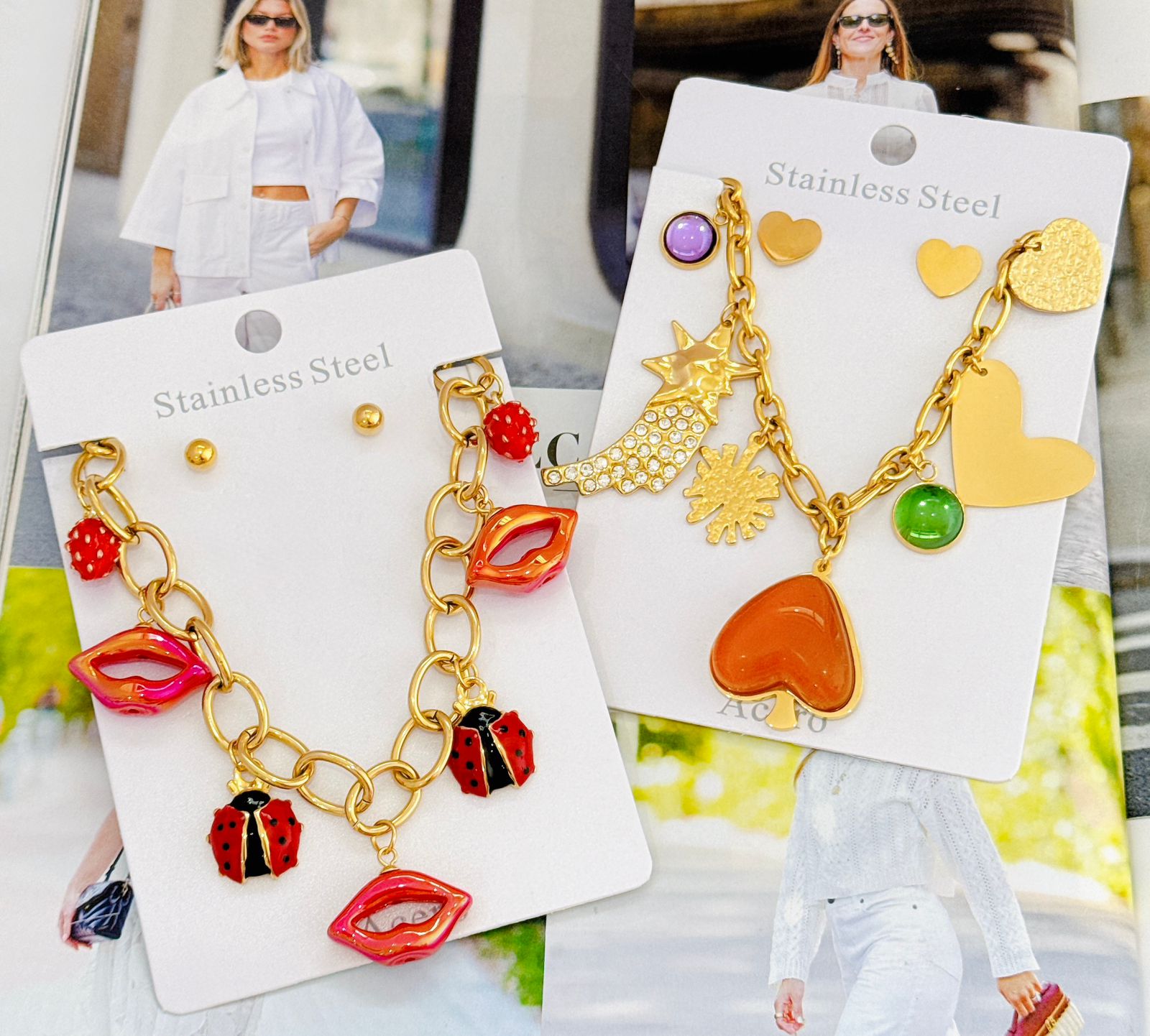 COLLAR Y ARETE MULTI CHARMS LABIOS Y MULTI CHARMS DE CORAZON