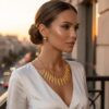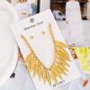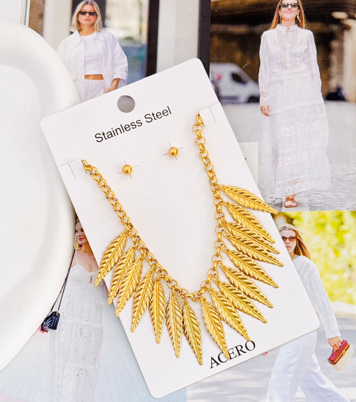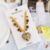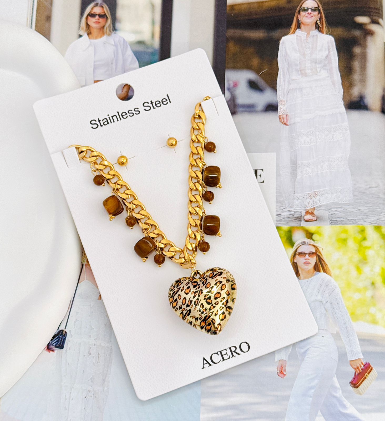 COLLAR Y ARETE MULTI HOJAS Y ESLABON CON DIJE CORAZON ANIMAL PRINT