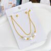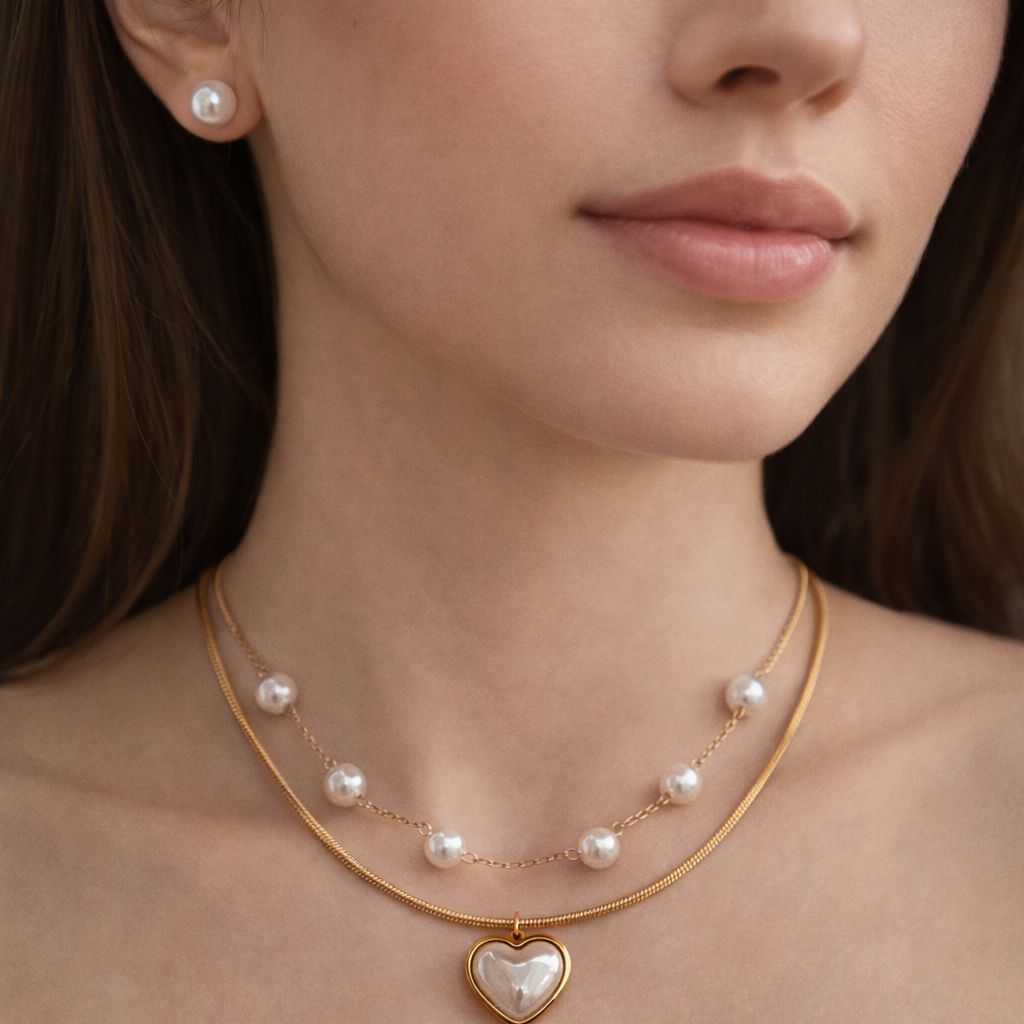 COLLAR Y ARETE PERLA DOBLE CAIDA CON CORAZON