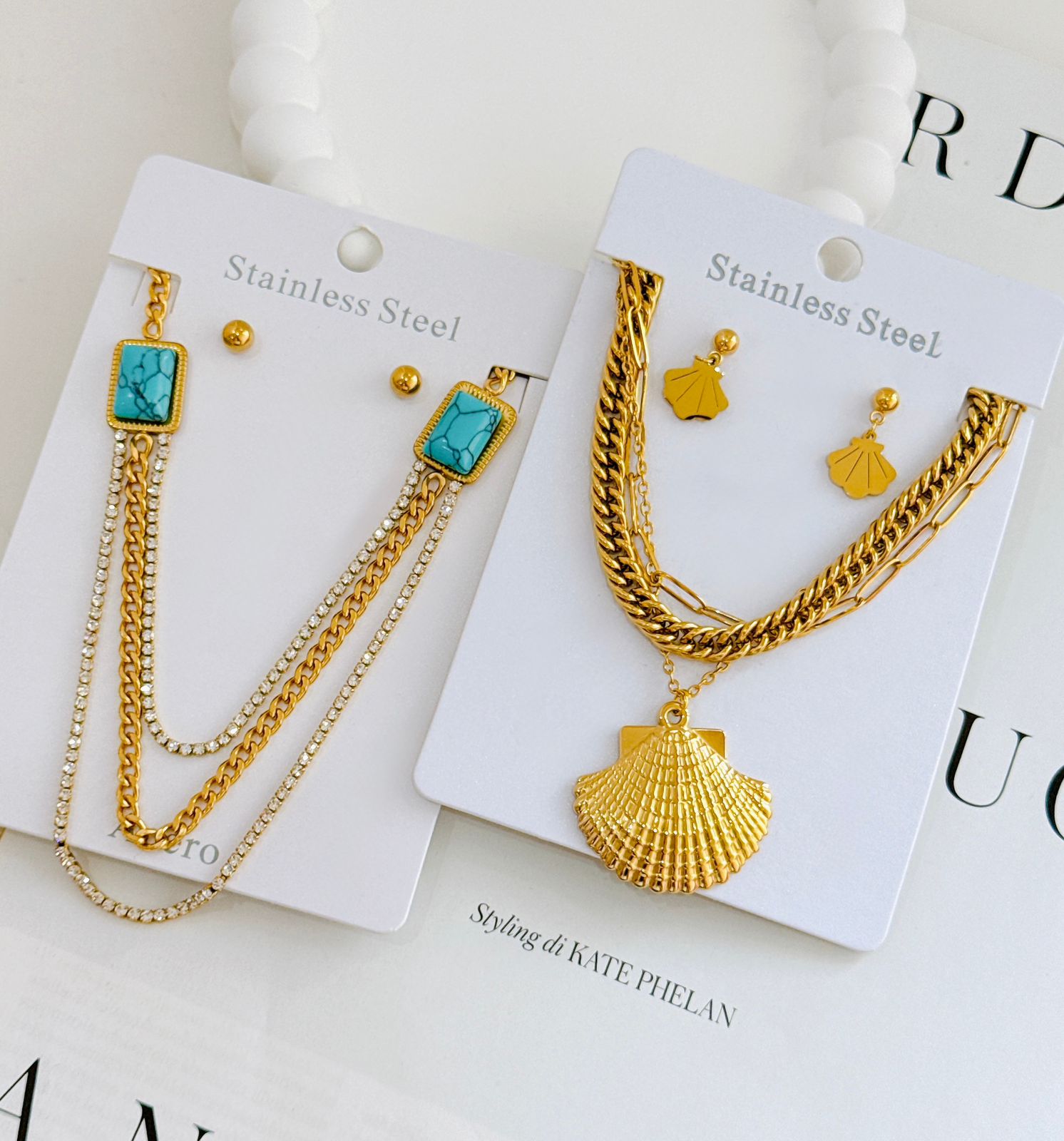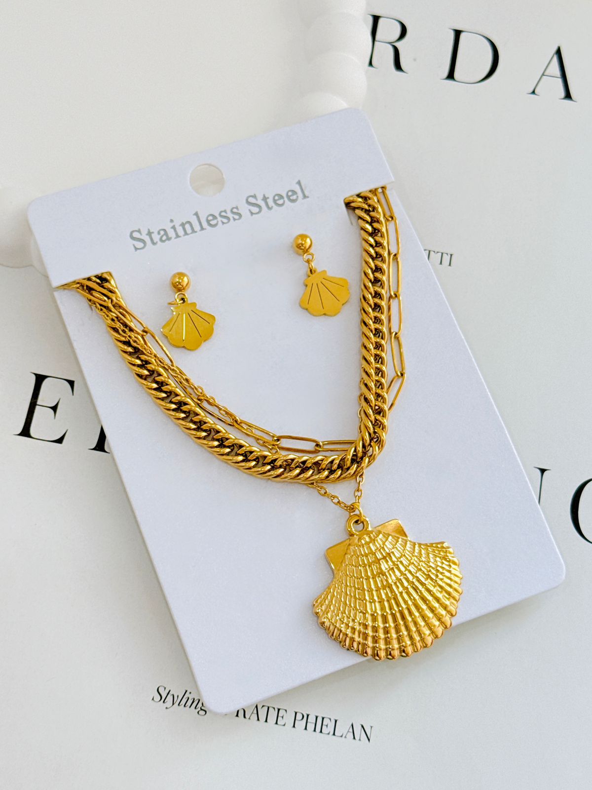 COLLAR Y ARETE TRIPLE CAIDA ALMEJA O CON CRISTALES