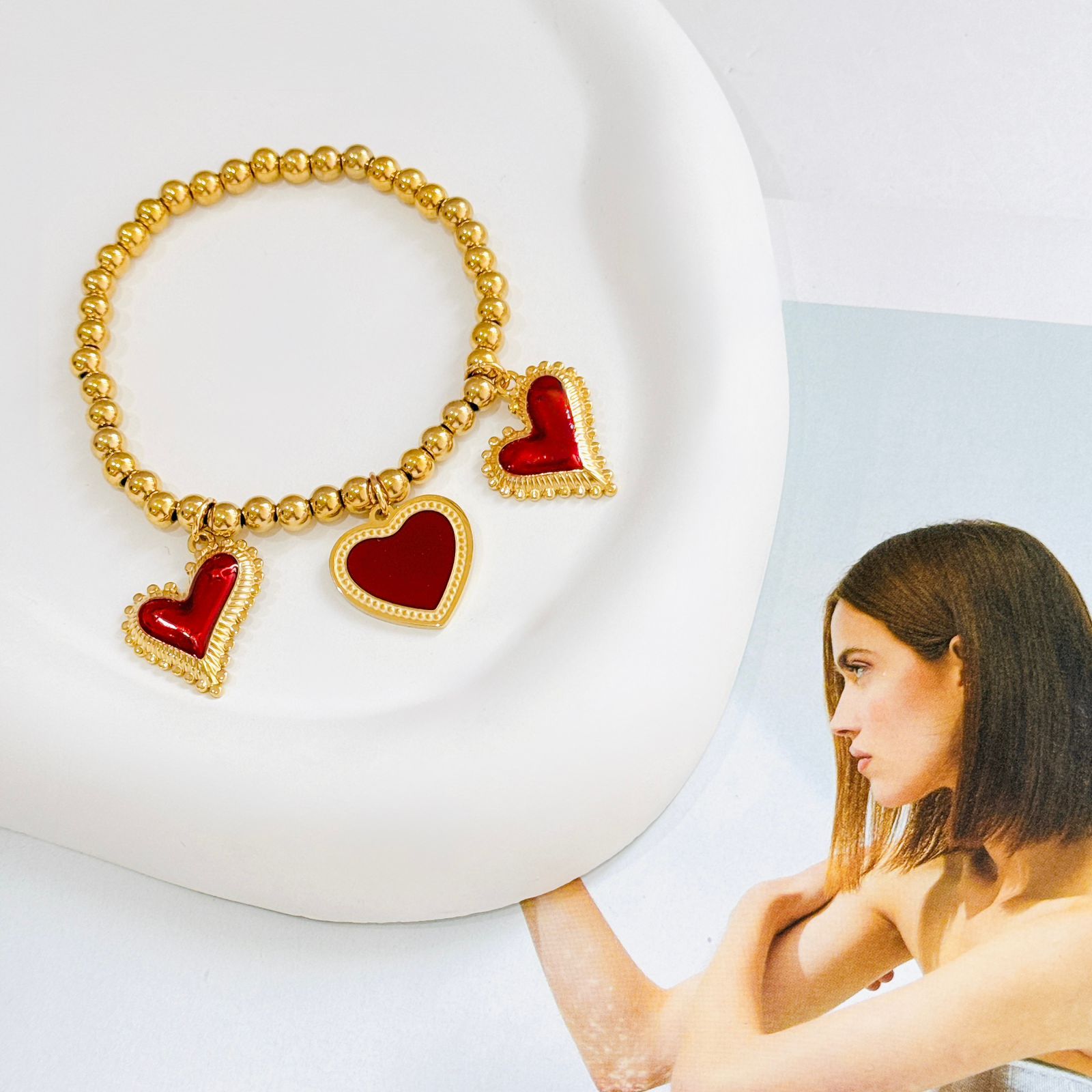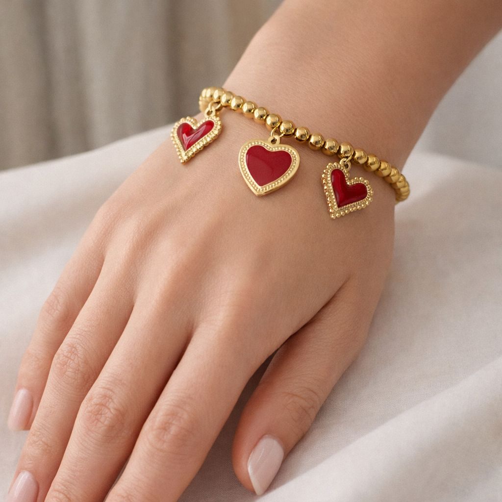 PULSERA BOLITA CON TRES CORAZONES ROJO