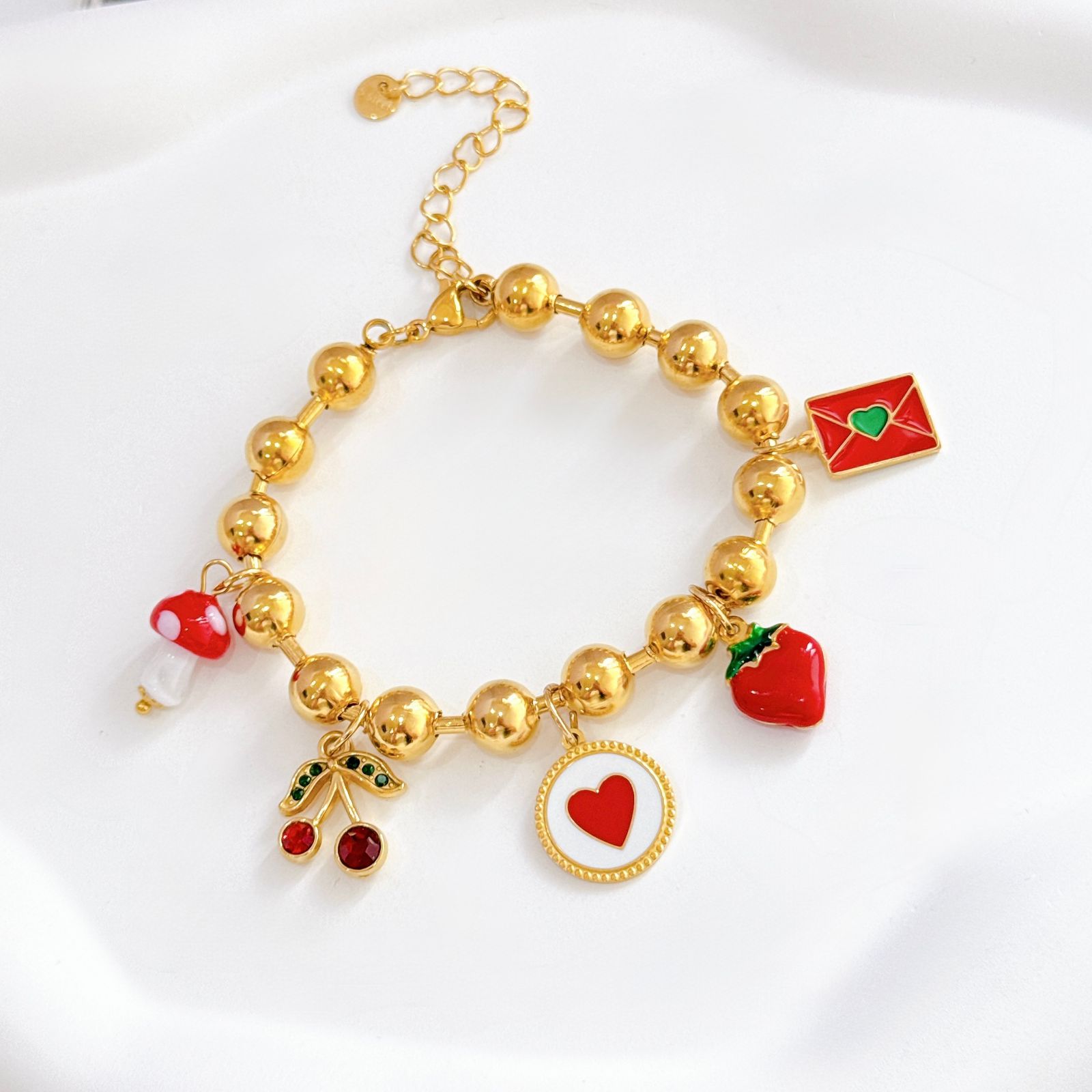 PULSERA BOLITA MULTI CHARMS CEREZA Y FRESA DORADO