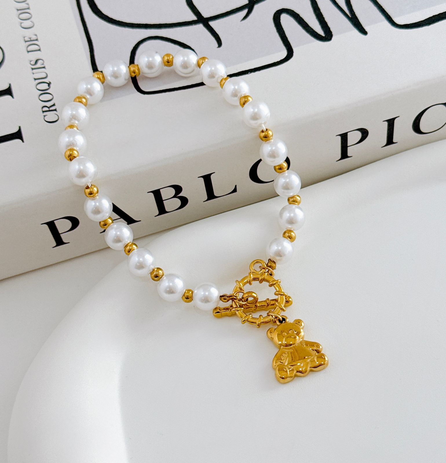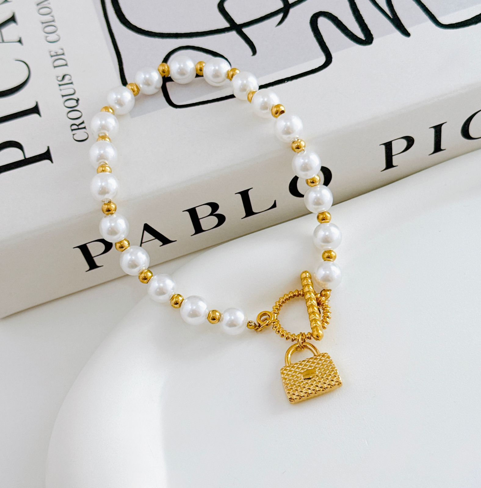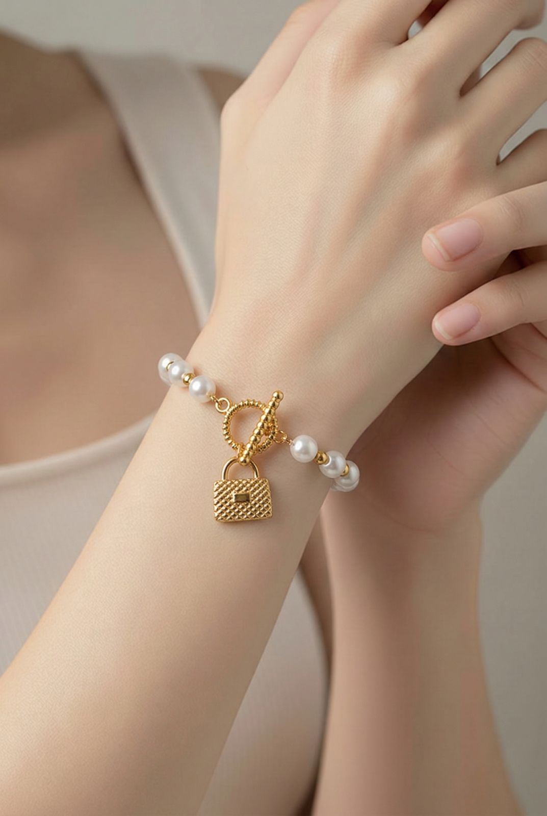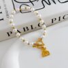 PULSERA CON PERLA Y BROCHE T CON DIJE