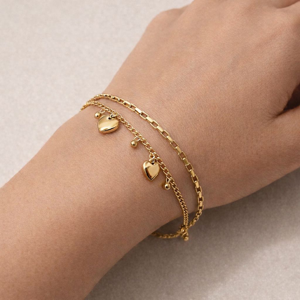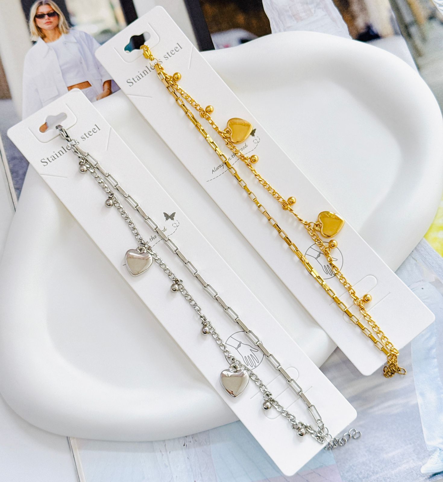 PULSERA DE DOBLE CAIDA CORAZON Y BOLITA DORADO/PLATA