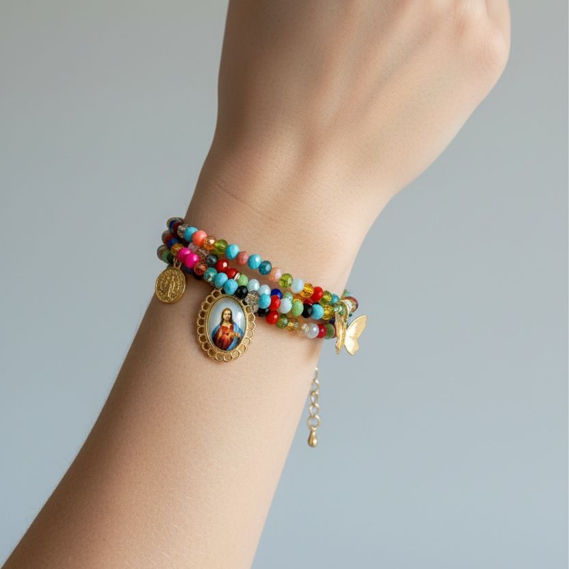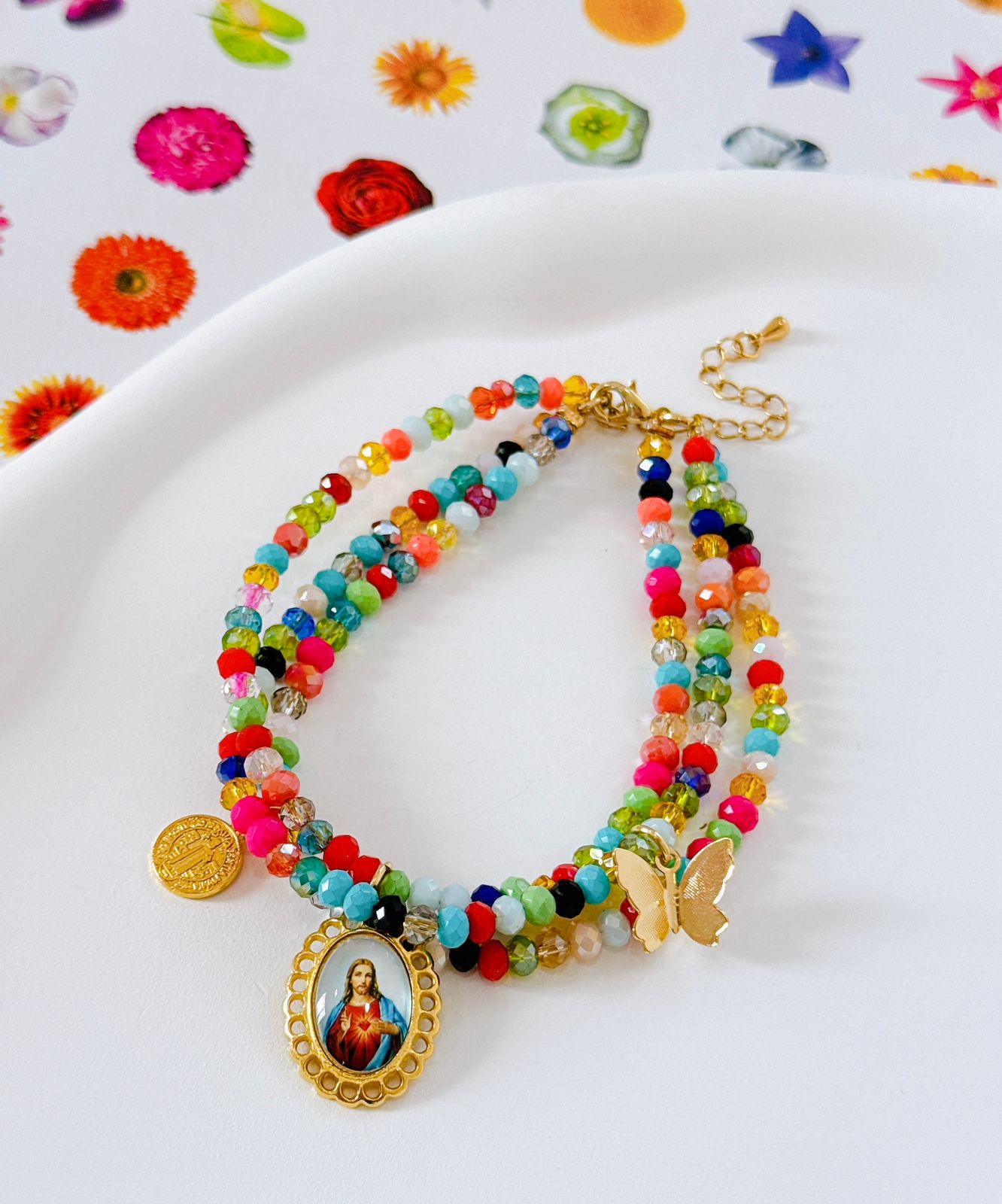 PULSERA TRIPLE CON CRISTAL Y DIJE DE JESUS